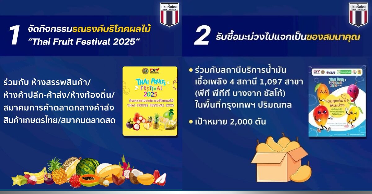 - จัดกิจกรรมรณรงค์บริโภคผลไม้ “Thai Fruit Festival 2025” ร่วมกับ ห้างสรรพสินค้า/ห้างค้าปลีก-ค้าส่ง/ห้างท้องถิ่น/สมาคมการค้าตลาดกลางค้าส่งสินค้าเกษตรไทย/สมาคมตลาดสด