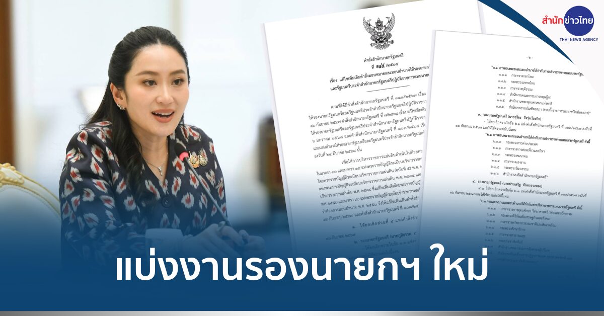 กรุงเทพฯ 21 มิ.ย. – นายกฯ ลงนามคำสั่งแบ่งงานรองนายกฯใหม่ หลัง “ภูมิใจไทย” ถอนตัวพรรคร่วมรัฐบาล “ภูมิธรรม” กำกับดูแล “มหาดไทย” ไร้ชื่อ “พีระพันธุ์” กำกับงานส่วนไหนเพิ่มเติม