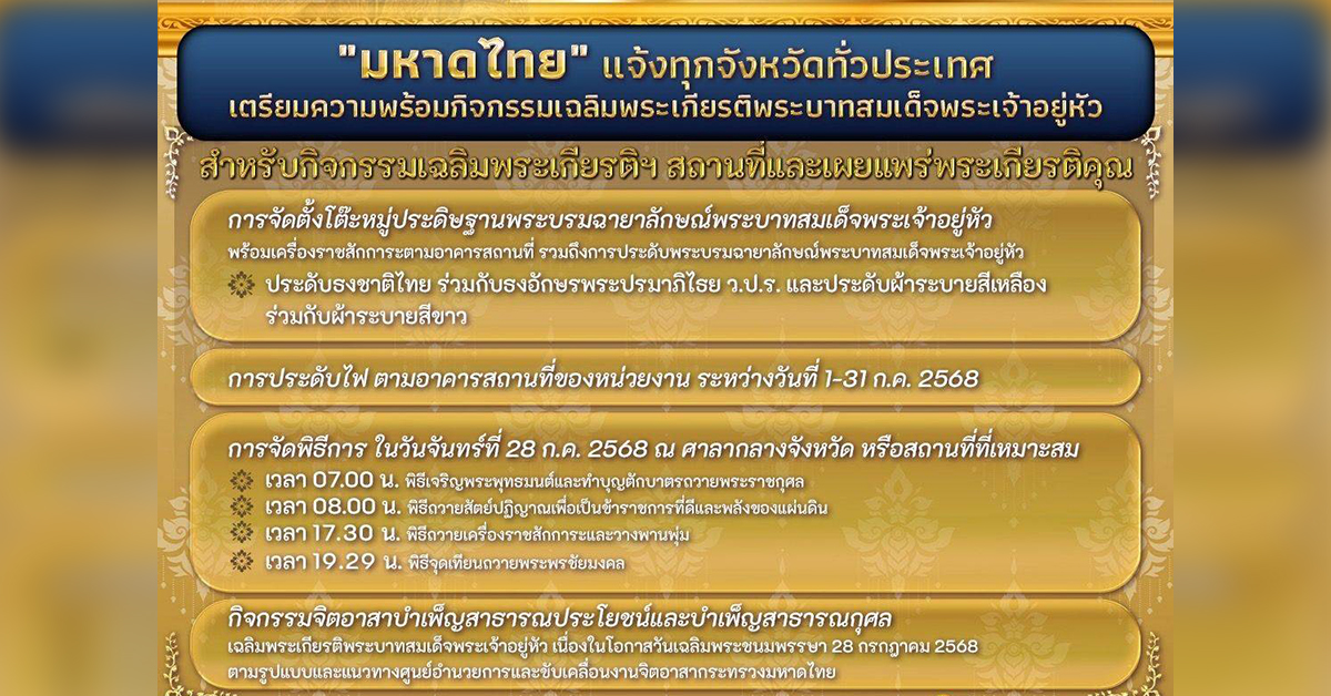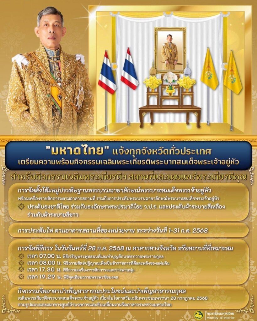 กทม. 22 มิ.ย. – “มหาดไทย” แจ้งทุกจังหวัดทั่วประเทศ เตรียมความพร้อมกิจกรรมเฉลิมพระเกียรติพระบาทสมเด็จพระเจ้าอยู่หัว เนื่องในโอกาสวันเฉลิมพระชนมพรรษา 28 กรกฎาคม 2568