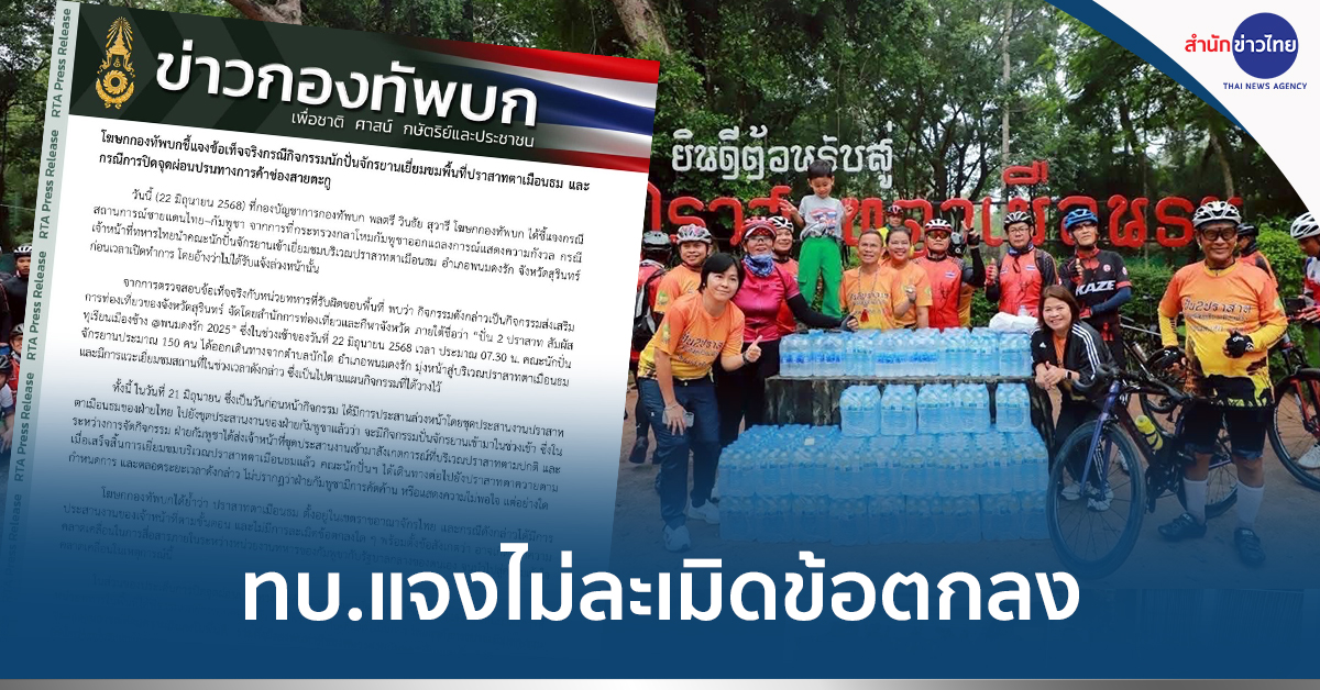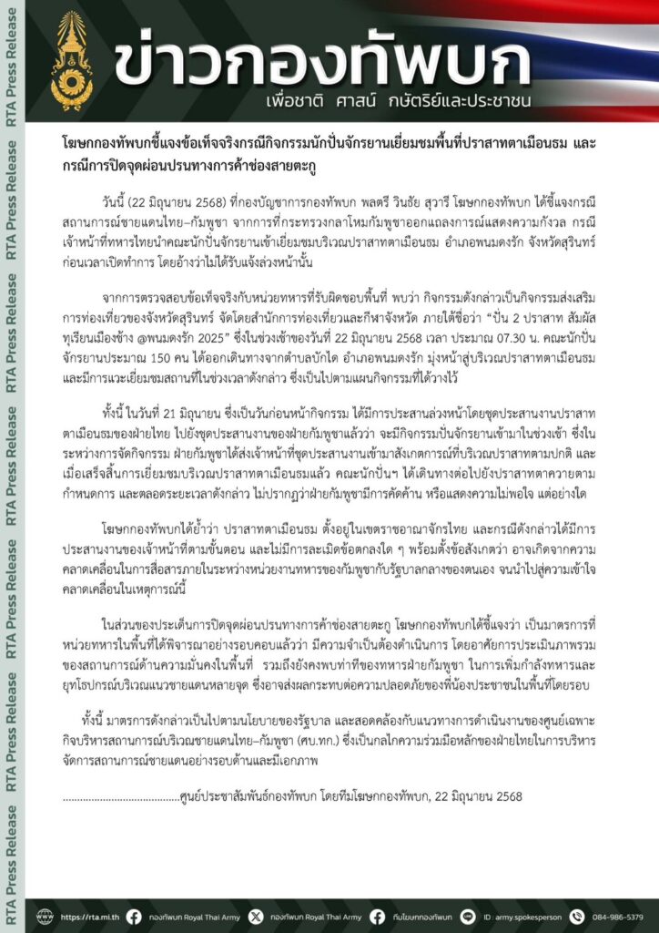 22 มิ.ย. – โฆษกกองทัพบก ชี้แจงข้อเท็จจริงกรณีกิจกรรมปั่นจักรยาน ย้ำ “ปราสาทตาเมือนธม” ตั้งอยู่ในเขตราชอาณาจักรไทย ไม่มีการละเมิดข้อตกลงใดๆ ส่วนกรณีปิดด่านช่องสายตะกู เพื่อความปลอดภัยของประชาชน