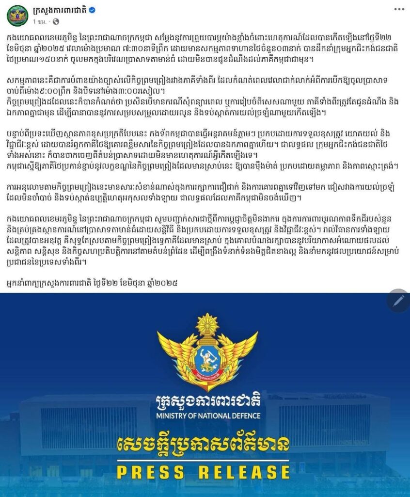 โฆษกกองทัพบก ย้ำว่า ปราสาทตาเมือนธม ตั้งอยู่ในเขตราชอาณาจักรไทย และกรณีดังกล่าวได้มีการประสานงานของเจ้าหน้าที่ตามขั้นตอน และไม่มีการละเมิดข้อตกลงใดๆ พร้อมตั้งข้อสังเกตว่าอาจเกิดจากความคลาดเคลื่อนในการสื่อสารภายในระหว่างหน่วยงานทหารของกัมพูชากับรัฐบาลกลางของตนเอง จนนำไปสู่ความเข้าใจคลาดเคลื่อนในเหตุการณ์นี้