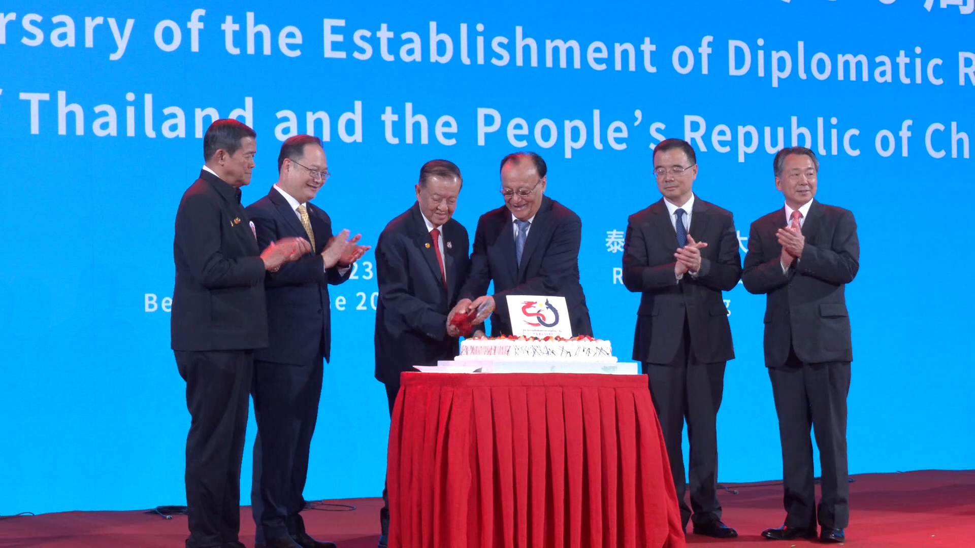 ไฮไลท์สำคัญทางฝ่ายไทยและจีนร่วมกันตัดขนมเค้กเพื่อเฉลิมฉลองความสัมพันธ์ทางการทูต 50 ปี ขณะเดียวกันในการเปิดตัวซองไปรษณีย์ที่ระลึกการฉลองความสัมพันธ์ทางการทูต ซึ่งจัดโดย China Post ก่อนที่จะถ่ายภาพร่วมกัน โดยบรรยากาศในงานวันนี้ยังมีการแสดงทางวัฒนธรรม จากฝ่ายไทยและฝ่ายจีน โดยสถานบัณฑิตพัฒนศิลป์ ชื่อชุดการแสดงนาฏศิลป์ไทยชุด “เทพประทานพร” ต่อด้วยการแสดงเดี่ยวระนาดเอก 4 ราง เพลง “ จีน-ไทยสัมพันธ์” นอกจากนี้การแสดงฝ่ายจีนโดย China National Ethnic Song And Dance Ensemble และปิดท้าย การบรรเลงเพลงดอกมะลิและเพลงสวัสดีประเทศไทย รวมถึงชุดการแสดงนาฏศิลป์จีนร่วมสมัย ที่ชื่อชุดว่าจิตวิญญาณแห่งนกยูง -สำนักข่าวไทย