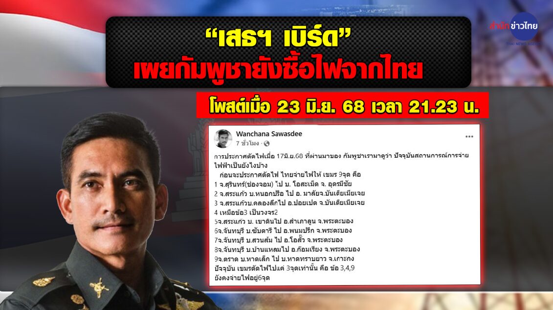 24 มิ.ย. – “เสธฯ เบิร์ด” เผยกัมพูชายังซื้อไฟจากไทย 6 จุด จากที่เคยซื้อ 9 จุด ตัดเพียง 3 จุด ที่คลองลึก-ปอยเปต และหาดเล็ก-เกาะกง เท่านั้น
