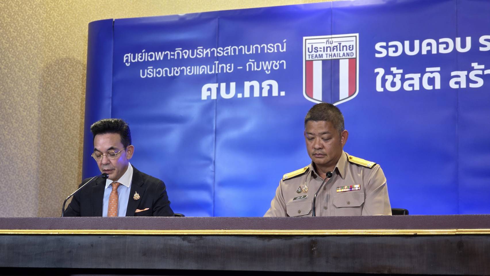 นายนิกรเดช พลางกูล อธิบดีกรมสารนิเทศ และโฆษกกระทรวงการต่างประเทศ และพล.ร.ต.สุรสันต์ คงสิริ โฆษก ศบ.ทก. ด้านความมั่นคง แถลงภายหลังการประชุมศูนย์เฉพาะกิจบริหารสถานการณ์บริเวณชายแดนไทย – กัมพูชา ประจำวัน อังคารที่ 24 มิถุนายน 2568