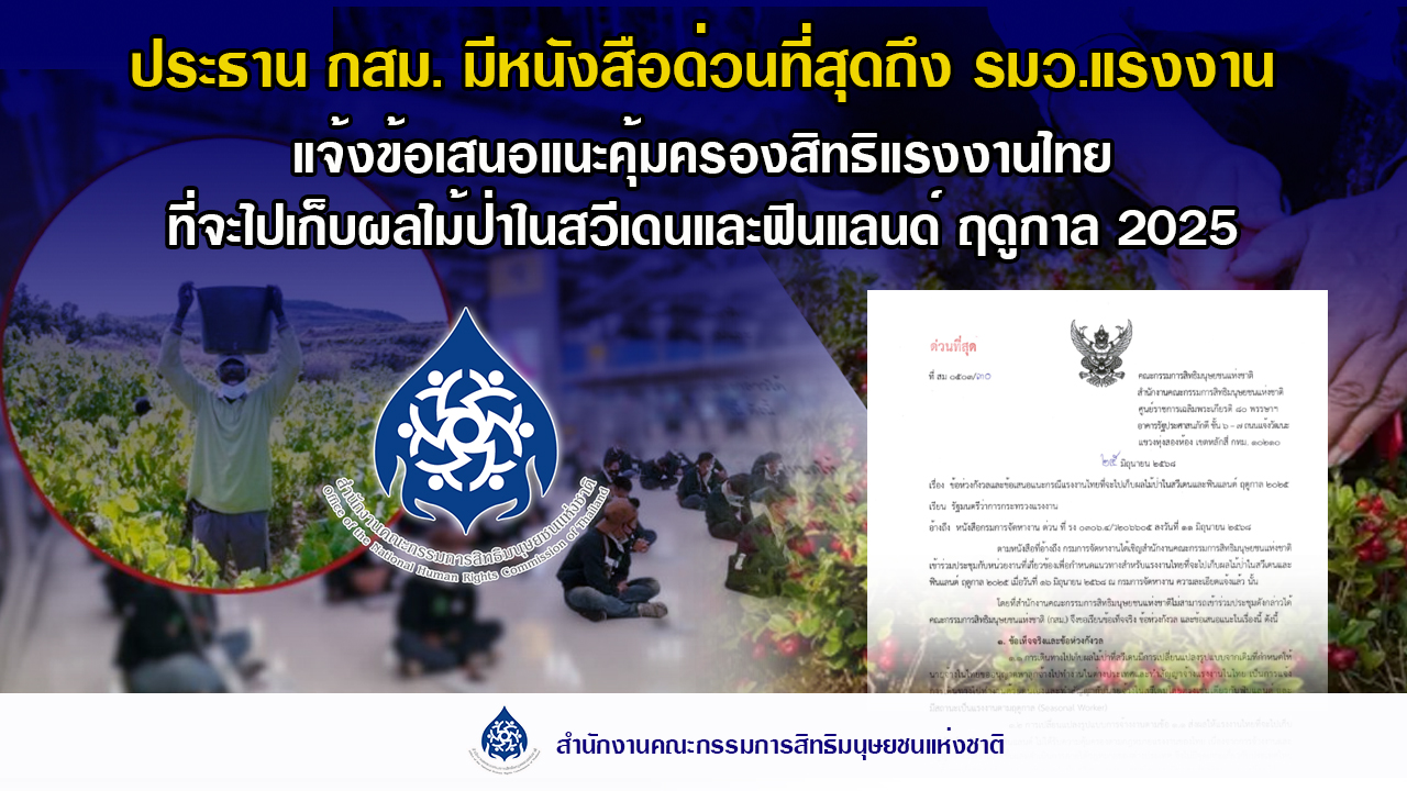 กสม. 27 มิ.ย.- ประธาน กสม. มีหนังสือด่วนที่สุดถึง “รัฐมนตรีแรงงาน” ห่วงแรงงานไทยที่จะไปเก็บผลไม้ป่าในสวีเดนและฟินแลนด์ ฤดูกาล 2025 เสนอแนะมาตรการเพื่อคุ้มครองมิให้ถูกละเมิดสิทธิฯ