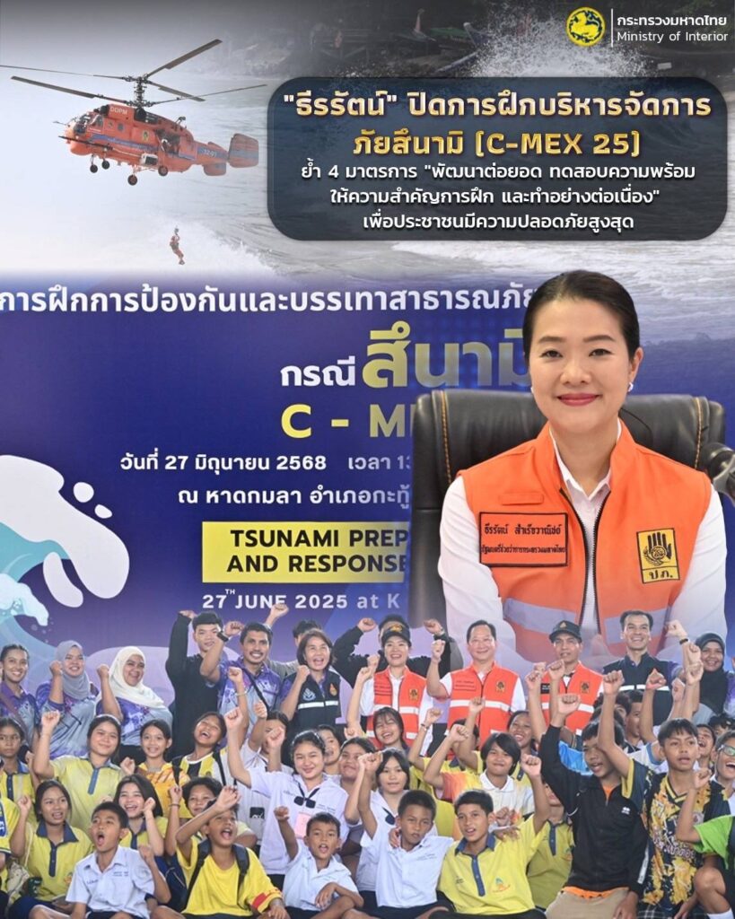 น.ส.ธีรรัตน์ สำเร็จวาณิชย์ รัฐมนตรีช่วยว่าการกระทรวงมหาดไทย รักษาราชการแทนรัฐมนตรีว่าการกระทรวงมหาดไทย เป็นประธานตรวจเยี่ยมกำลังพลและภาคีเครือข่าย เเละปิดการฝึกการบริหารวิฤตการณ์ระดับชาติด้านสาธารณภัย ประจำปี พ.ศ. 2568 (Crisis Management Exercise: C-MEX 25) จากภัยสึนามิ ในพื้นที่ 6 จังหวัดชายฝั่งทะเลอันดามัน ณ โรงเรียนราชประชานุเคราะห์ 36 จังหวัดภูเก็ต ต.กมลา อ.กะทู้ จ.ภูเก็ต โดยมีการถ่ายทอดการฝึกซ้อมจากอีก 5 จังหวัดชายฝั่งทะเลอันดามันมายัง จ.ภูเก็ต โดยมี นายภาสกร บุญญลักษม์ อธิบดีกรมป้องกันและบรรเทาสาธารณภัย นายโสภณ สุวรรณรัตน์ ผู้ว่าราชการจังหวัดภูเก็ต พล.ท.อนุสรณ์ โออุไร แม่ทัพน้อยที่ 4 นายรัชกรณ์ นภาพรพิพัฒน์ รองเลขาธิการสภาความมั่นคงแห่งชาติ พร้อมด้วยผู้แทน จ.กระบี่ พังงา ระนอง ตรัง และ จ.สตูล ส่วนราชการที่เกี่ยวข้อง ผู้แทนสถานเอกอัครราชทูต/สถานกงสุลต่างประเทศ สมาชิกสภาผู้แทนราษฎร ผู้บริหารองค์กรปกครองส่วนท้องถิ่น และภาคีเครือข่าย ร่วมฝึกซ้อมในพื้นที่ 6 จังหวัดชายฝั่งทะเลอันดามัน จำนวนกว่า 1,000 คน