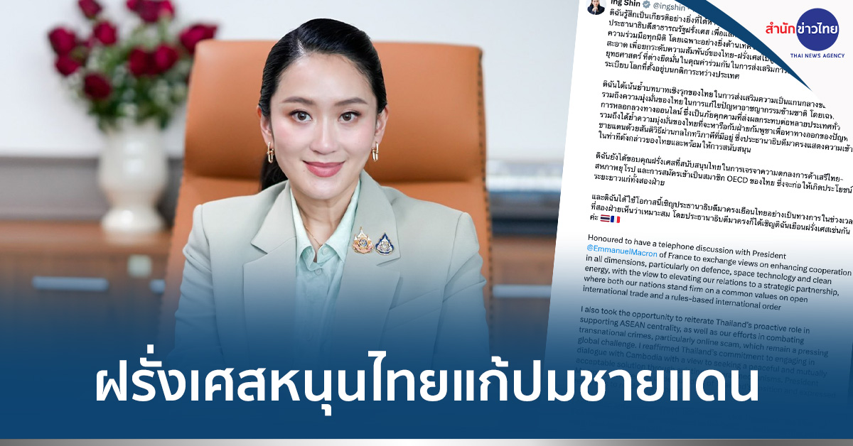 นางสาวแพทองธาร ชินวัตร นายกรัฐมนตรี โพสต์ข้อความเผยผลการหารือทางโทรศัพท์กับนายเอมานูว์แอล มาครง ประธานาธิบดีสาธารณรัฐฝรั่งเศสระบุ “ดิฉันรู้สึกเป็นเกียรติอย่างยิ่งที่ได้หารือทางโทรศัพท์กับท่านเอมานูว์แอล มาครง ประธานาธิบดีสาธารณรัฐฝรั่งเศส เพื่อแลกเปลี่ยนข้อคิดเห็นถึงการสานต่อและกระชับความร่วมมือทุกมิติ โดยเฉพาะอย่างยิ่งด้านเทคโนโลยีอวกาศ กลาโหม และพลังงานสะอาด เพื่อยกระดับความสัมพันธ์ของไทย-ฝรั่งเศสไปสู่ความเป็นหุ้นส่วนทางยุทธศาสตร์ ที่ต่างยึดมั่นในคุณค่าร่วมกันในการส่งเสริมการค้าเสรีระหว่างประเทศและระเบียบโลกที่ตั้งอยู่บนกติการะหว่างประเทศ