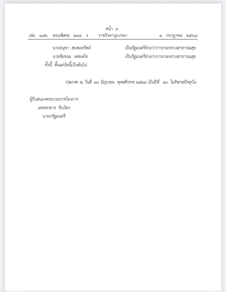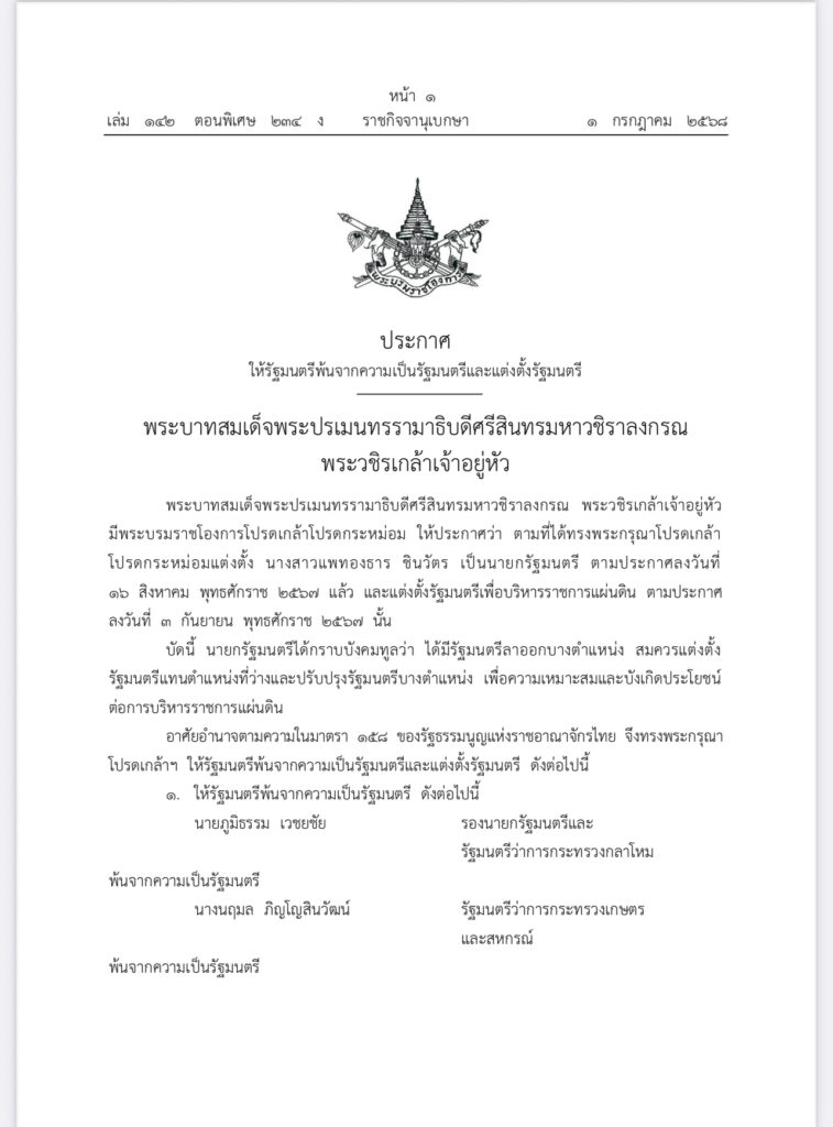 ทั้งนี้ ตั้งแต่บัดนี้เป็นต้นไป ประกาศ ณ วันที่ 30 มิถุนายน พุทธศักราช 2568 เป็นปีที่ 10 ในรัชกาลปัจจุบัน ผู้รับสนองพระบรมราชการโอง นางสาวแพทองธาร ชินวัตร นายกรัฐมนตรี.-316 -สำนักข่าวไทย