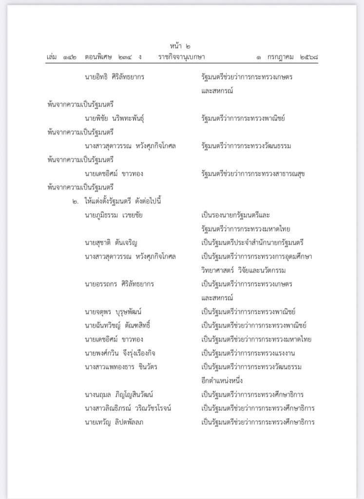 กรุงเทพฯ 1 ก.ค.- โปรดเกล้าฯ ครม.ชุดใหม่ “แพทองธาร 1/2” นายกฯ นั่งควบ รมว.วัฒนธรรม ขณะที่ “ภูมิธรรม” นั่งรองนายกฯ ควบ มท.1