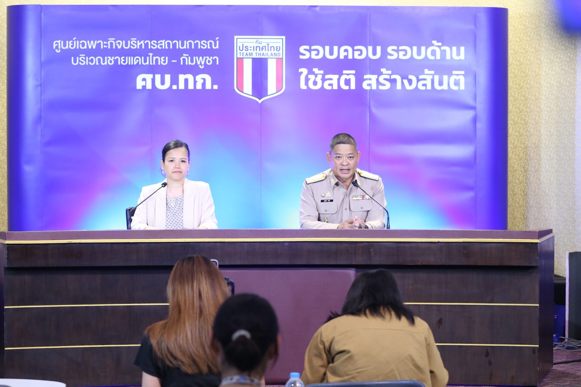 พลเรือตรีสุรสันต์ คงสิริ รองโฆษกกองบัญชาการกองทัพไทย และ นางมาระตี นะลิตา อันดาโม รองอธิบดีกรมสารนิเทศ และรองโฆษกกระทรวงการต่างประเทศ แถลงผลการประชุมศูนย์เฉพาะกิจบริหารสถานการณ์บริเวณชายแดนไทย-กัมพูชา หรือ ศบ.ทก. ประจำวันพุธที่ 2 กรกฎาคม 2568 โดยพลเรือตรีสุรสันต์ กล่าวว่า การดำเนินการของ ศบ.ทก. จะยังดำเนินการอย่างต่อเนื่องไม่หยุด แม้จะมีการปรับเปลี่ยนคณะรัฐมนตรี โดยมติสภาความมั่นคงแห่งชาติครั้งที่ 5/2568 เมื่อวันที่ 27 มิถุนายน ที่ผ่านมาเรื่องมาตรการรองรับสถานการณ์ความมั่นคงในพื้นที่บริเวณชายแดนไทยกัมพูชา ได้มีมติ 4 ข้อ คือการรับทราบผลการปฏิบัติของ ศบ.ทก.ในการควบคุมพื้นที่ใช้แดนไทยกัมพูชา พร้อมกับให้ความเห็นชอบกำหนดงานที่เกี่ยวข้องดำเนินการตามมติ สมช. อาทิ มาตรการควบคุมและผ่อนปรนบุคคลยานพาหนะสินค้า รวมทั้งมาตรการบรรเทาผลกระทบต่างๆ รวมไปถึงการเห็นชอบการขยายมาตรการควบคุมจุดผ่านแดนประเภทต่างๆ ให้ครอบคลุมทั้งการจำกัดและการผ่อนผันบุคคลยานพาหนะและสินค้าที่ผ่านเข้าออกจุดผ่านแดน และมอบหมายให้ ศบ.ทก.เป็นกลไกหลักในการพิจารณา ยกระดับหรือผ่อนปรนมาตรการ รองรับสถานการณ์ความมั่นคงในบริเวณพื้นที่ชายแดนไทย-กัมพูชา ภายใต้กรอบแนวทางที่รัฐบาลหรือสภาความมั่นคงแห่งชาติ กำหนดให้เหมาะสมกับสถานการณ์