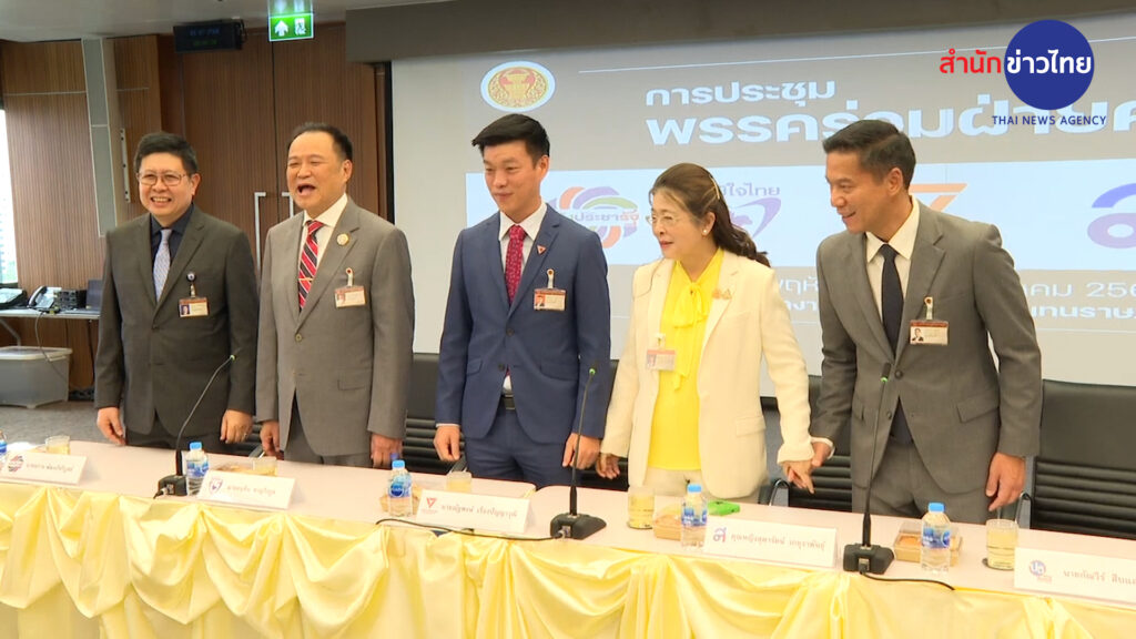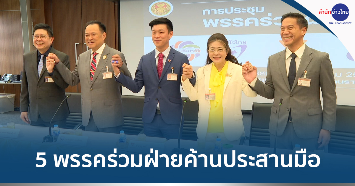 ทั้งนี้ ก่อนการเริ่มประชุม ได้มีการประสานมือกันระหว่างตัวแทนของทั้ง 5 พรรคร่วมฝ่ายค้าน