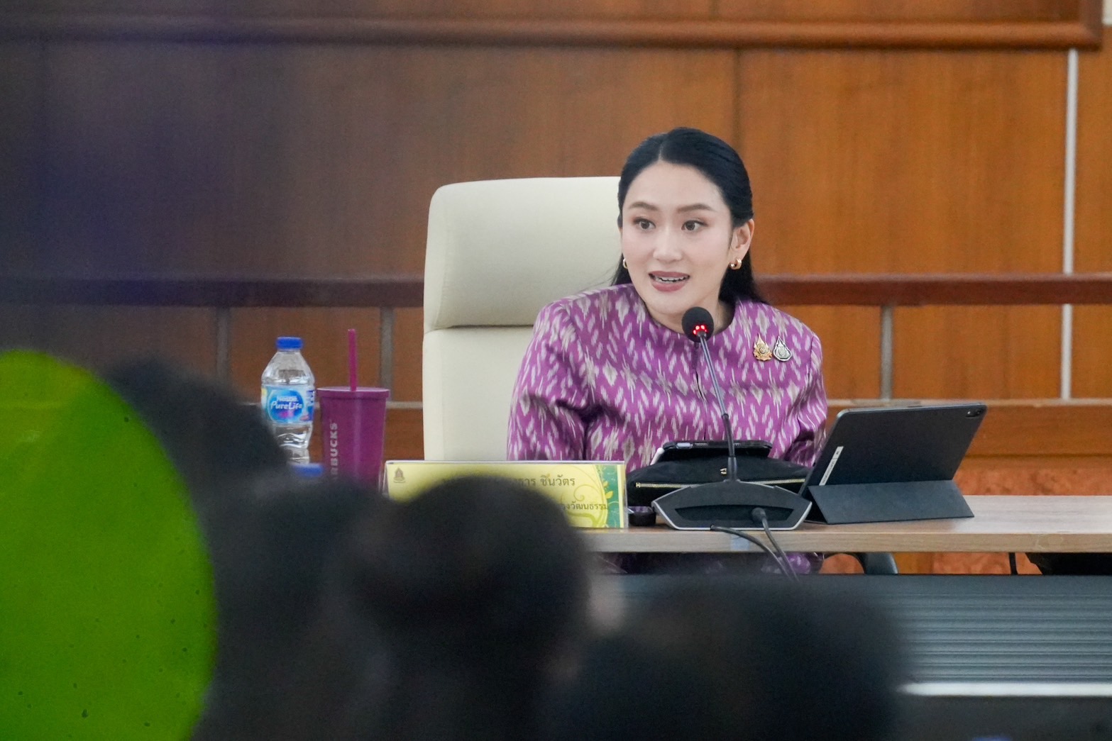 โดย น.ส.แพทองธาร กล่าวว่า วันนี้ถือเป็นการประชุมครั้งแรก มีข้อที่อยากจะฝากเอาไว้ และอยากจะให้ช่วยกันผลักดัน รวมถึงอยากจะอัปเดตข้อมูลให้ฟัง ซึ่งวันนี้ตนได้ทำการบ้านมาเล็กน้อย และรู้สึกดีใจที่จะได้ฟังจากทุกคนว่า แต่ละหน่วยงานแต่ละฝ่ายทำอะไรกันอยู่บ้าง และในกระทรวงฯ มีอะไรที่อยากให้ดำเนินการเพิ่มเติมบ้าง