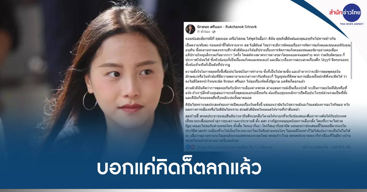 ความตั้งใจในการคุยครั้งนี้เพื่อประโยชน์ในการทำงาน ซึ่งก็เป็นไปตามนั้น และถ้าหากว่าจะมีการคุยพูดคุยในลักษณะหรือในหัวข้อที่มีความพยายามจะกล่าวหากันจริงละก็ วิญญูชนที่ติดตามการเมืองเป็นปกติพึงจะคิดได้ ว่าคงไม่มีใครหน้าไหนจะนัด รักชนก ศรีนอก ไปคุยเรื่องจัดตั้งรัฐบาล แค่คิดก็ตลกแล้ว