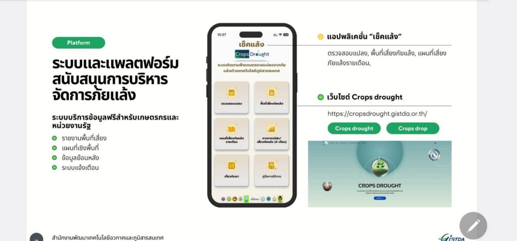 นายธวัช สุระบาล ประธานคณะกรรมาธิการการเกษตรและสหกรณ์ วุฒิสภา เปิดเผยว่า ทางคณะกรรมาธิการฯเตรียมผลักดันแพลตฟอร์ม “Crops Drought” หรือที่รู้จักกันในชื่อแอปพลิเคชัน “เช็คแล้ง” ของ GISTDA หรือสำนักงานพัฒนาเทคโนโลยีอวกาศและภูมิสารสนเทศ เพื่อเป็นเครื่องมือสำคัญระดับชาติ เพื่อรับมือกับวิกฤติภัยแล้งซ้ำซากที่ส่งผลกระทบต่อเศรษฐกิจ สังคม และความมั่นคงทางอาหารของประเทศอย่างหนัก