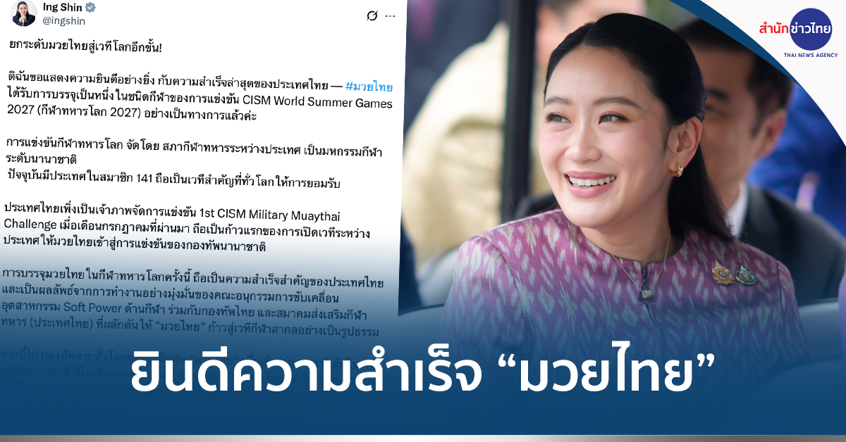 ยกระดับมวยไทยสู่เวทีโลกอีกขั้น ดิฉันขอแสดงความยินดีอย่างยิ่ง กับความสำเร็จล่าสุดของประเทศไทย — #มวยไทย ได้รับการบรรจุเป็นหนึ่งในชนิดกีฬาของการแข่งขัน CISM World Summer Games 2027 (กีฬาทหารโลก 2027) อย่างเป็นทางการแล้วค่ะ