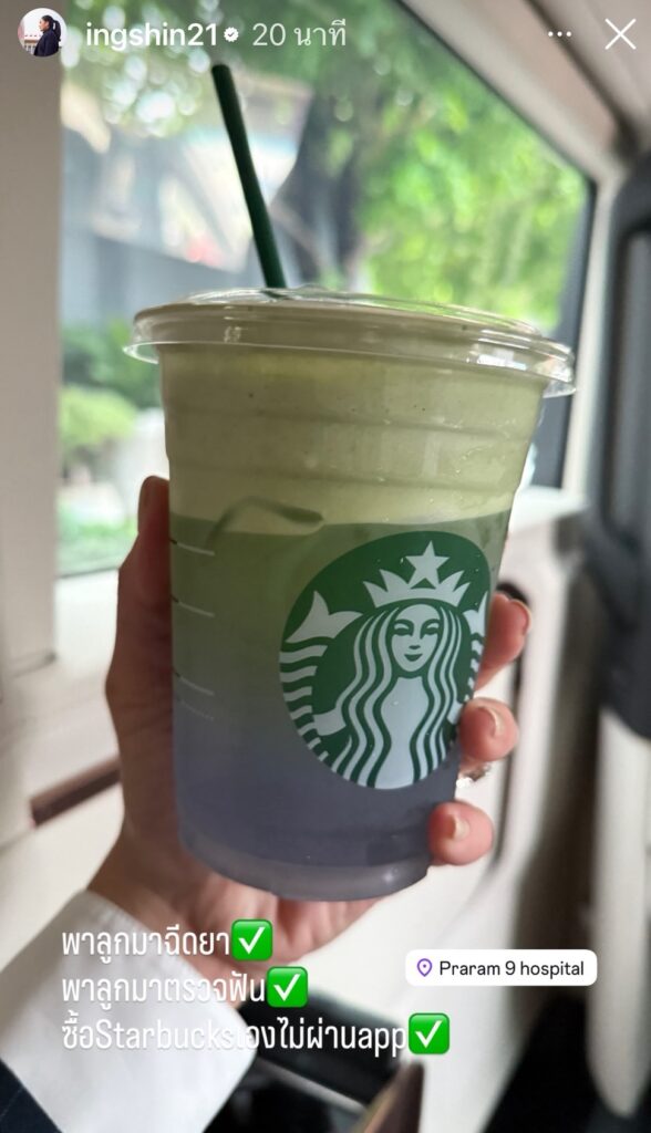 ผู้สื่อข่าวรายงาน ก่อนเดินทางเข้าบ้านพิษณุโลก นางสาวแพทองธาร ได้โพสต์ภาพแก้วกาแฟ ลงบน สตอรี่ไอจี โดยเช็กอินโรงพยาบาลพระราม 9 พร้อมระบุข้อความว่า ”พาลูกมาฉีดยา พาลูกมาตรวจฟัน.-316.-สำนักข่าวไทย