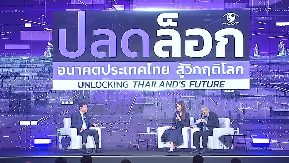นายทักษิณ ชินวัตร อดีตนายกรัฐมนตรี ให้สัมภาษณ์ในรายการ “ฟังหูไว้หู” ของสำนักข่าวไทย โดยมีนายวีระ ธีรภัทร และนางสาวชุติมา พึ่งความสุข เป็นผู้ดำเนินรายการสด ในงานปลดล็อกอนาคตประเทศไทย สู้วิกฤตโลก