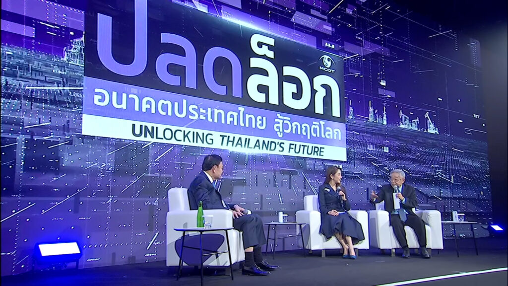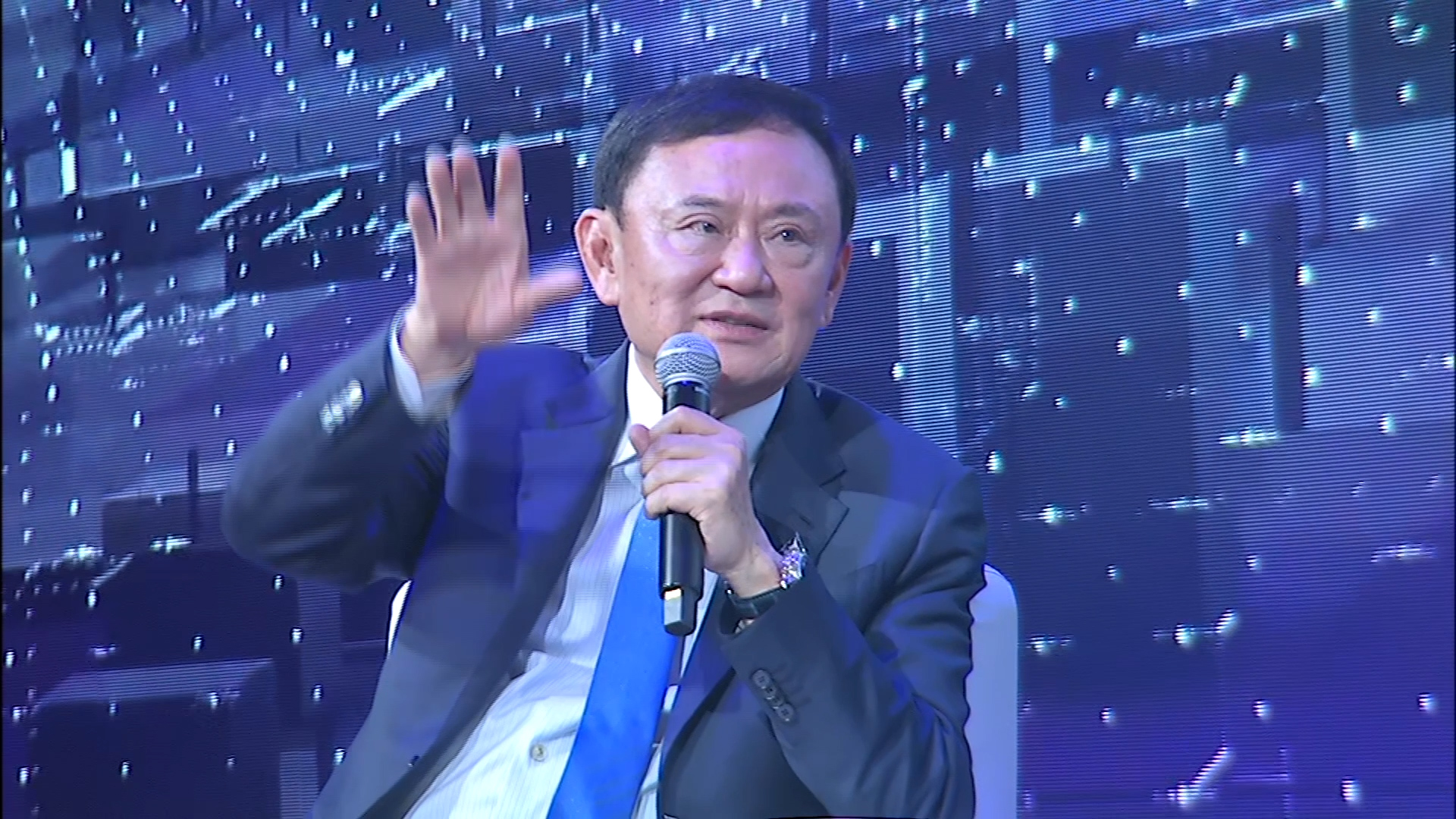 นายทักษิณ ชินวัตร อดีตนายกรัฐมนตรี ให้สัมภาษณ์พิเศษ กับ นายวีระ ธีรภัทร และ นางสาวชุติมา พึ่งความสุข พิธีกรรายการ “ฟังหูไว้หู” ของช่อง 9 MCOT HD ในงานเสวนา ปลดล็อกอนาคตประเทศไทย สู้วิกฤติโลก Unlocking Thailand’s Future จัดโดยบริษัท อสมท จำกัด (มหาชน)