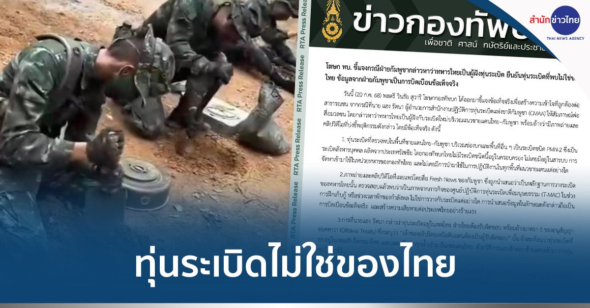 20 ก.ค.- โฆษก ทบ. ชี้แจงกรณีฝ่ายกัมพูชากล่าวหาว่าทหารไทยเป็นผู้ฝังทุ่นระเบิด ยืนยันทุ่นระเบิดที่พบไม่ใช่ของไทย ข้อมูลจากฝ่ายกัมพูชาเป็นการบิดเบือนข้อเท็จจริง