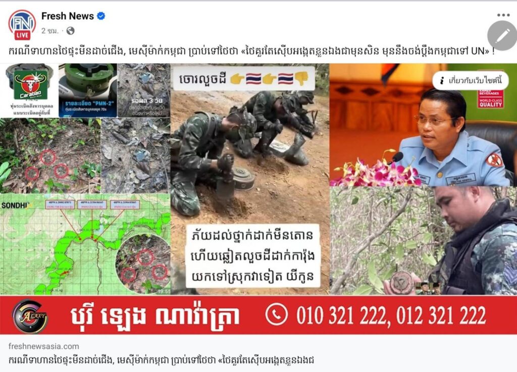 2. ภาพถ่ายและคลิปวิดีโอที่เผยแพร่โดยสื่อ Fresh News ของกัมพูชา ซึ่งถูกนำเสนอว่าเป็นหลักฐานการวางระเบิดของทหารไทยนั้น ตรวจสอบแล้วพบว่าเป็นภาพจากภารกิจของศูนย์ปฏิบัติการทุ่นระเบิดเพื่อมนุษยธรรม (T-MAC) ในช่วงการฝึกเก็บกู้ หรือช่วงเวลาพักของกำลังพล ไม่ใช่การวางกับระเบิดแต่อย่างใด การนำเสนอข้อมูลในลักษณะดังกล่าวถือเป็นการบิดเบือนข้อเท็จจริง และสร้างความเสียหายต่อประเทศไทยอย่างร้ายแรง