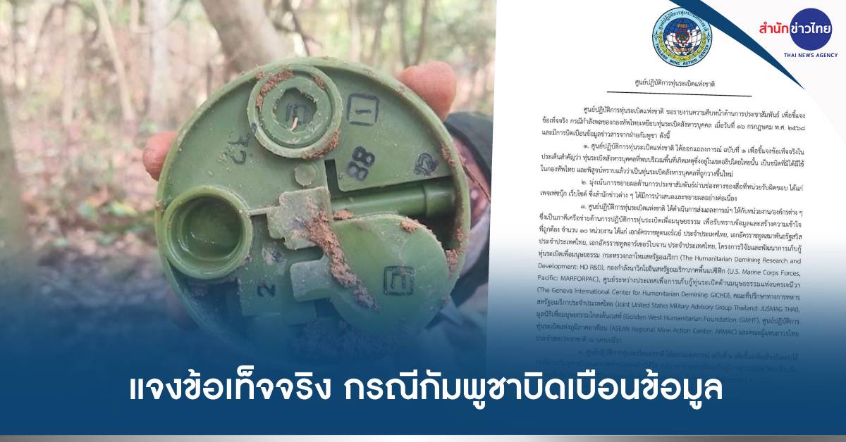 กทม. 22 ก.ค.-ศูนย์ปฏิบัติการทุ่นระเบิดแห่งชาติ ขอรายงานความคืบหน้าด้านการประชาสัมพันธ์ เพื่อชี้แจงข้อเท็จจริง กรณีกำลังพลของกองทัพไทยเหยียบทุ่นระเบิดสังหารบุคคล เมื่อวันที่ 16 กรกฎษคม พ.ศ.2568 และมีการบิดเบือนข้อมูลข่าวสารจากฝ่ายกัมพูชา ดังนี้