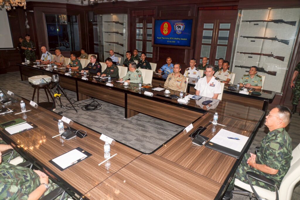 กองทัพบก 22 ก.ค.- ทบ. เชิญผู้ช่วยทูตทหาร 47 ประเทศ รับฟังคำชี้แจงสถานการณ์ชายแดนไทย-กัมพูชา หลังกำลังพลเหยียบกับระเบิดบาดเจ็บ 3 นาย พบ เป็นทุ่นระเบิดสังหารบุคคลวางใหม่ โดยมีหลายชาติ สนใจรับฟังขณะ พลจัตวา ฮอม คิม ผู้ช่วยทูตทหารดัมพูชา ร่วมด้วย