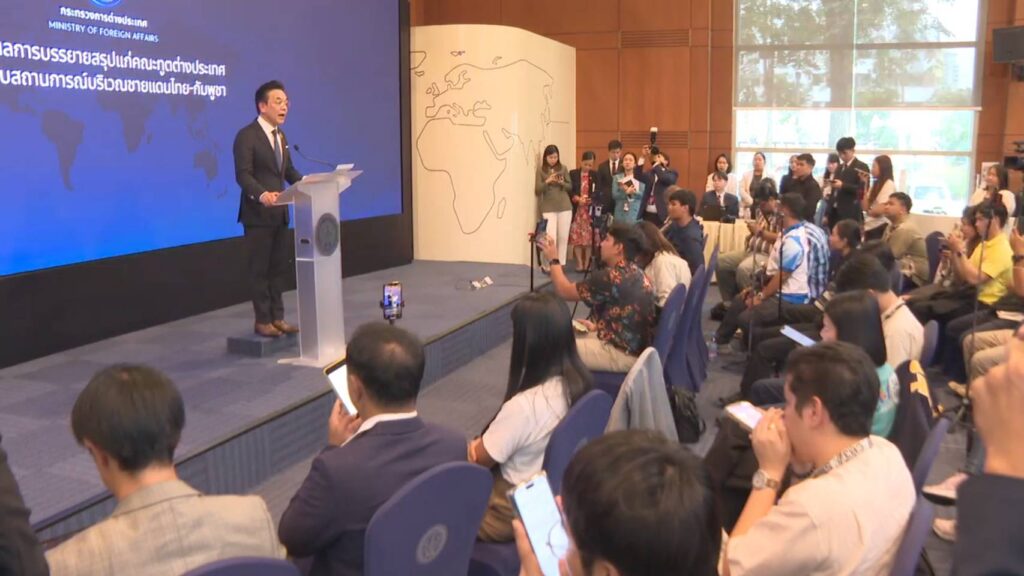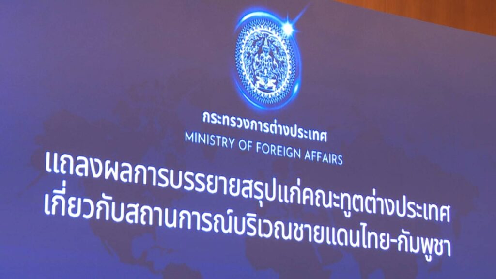 กระทรวงการต่างประเทศ 23 ก.ค.- กระทรวงการต่างประเทศ ยืนยันจุดยืนต่อคณะทูตจาก 68 ประเทศ “กัมพูชา” ละเมิดอนุสัญญาออตตาวา ละเมิดอธิปไตยไทย พร้อมยื่นประท้วงต่อประชาคมโลก เพื่อให้กัมพูชารับผิดชอบเยียวยาทหารที่ได้รับบาดเจ็บ และเก็บกู้ทุ่นระเบิด ยังไม่ถึงขั้นเรียกฑูตกลับประเทศ