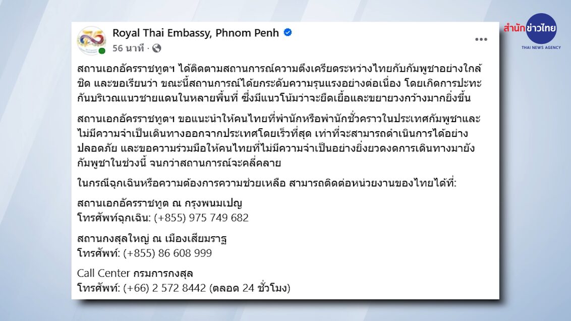 สถานเอกอัครราชทูตฯ ได้ติดตามสถานการณ์ความตึงเครียดระหว่างไทยกับกัมพูชาอย่างใกล้ชิด และขณะนี้สถานการณ์ได้ยกระดับความรุนแรงอย่างต่อเนื่อง โดยเกิดการปะทะกันบริเวณแนวชายแดนในหลายพื้นที่ ซึ่งมีแนวโน้มว่าจะยืดเยื้อและขยายวงกว้างมากยิ่งขึ้น ขอแนะนำให้คนไทยที่พำนักหรือพำนักชั่วคราวในประเทศกัมพูชาและไม่มีความจำเป็นเดินทางออกจากประเทศโดยเร็วที่สุด และขอความร่วมมือให้คนไทยที่ไม่มีความจำเป็นงดเดินทางมายังกัมพูชาในช่วงนี้ จนกว่าสถานการณ์จะคลี่คลาย