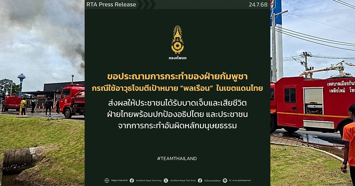 ที่กองบัญชาการกองทัพบก พ.อ.ริชฌา สุขสุวานนท์ รองโฆษกกองทัพบก เปิดเผยว่าจากสถานการณ์การปะทะพื้นที่ชายแดนไทย–กัมพูชา อันสืบเนื่องมาจากฝ่ายกัมพูชาเปิดฉากยิงเข้าใส่ฐานทหารไทยที่ปราสาทตาเมือนธม จ.สุรินทร์ ตั้งแต่เมื่อเช้าวันนี้ (24 ก.ค. 68)