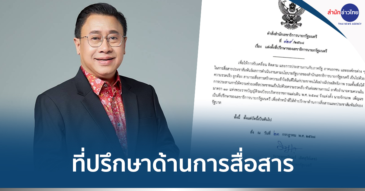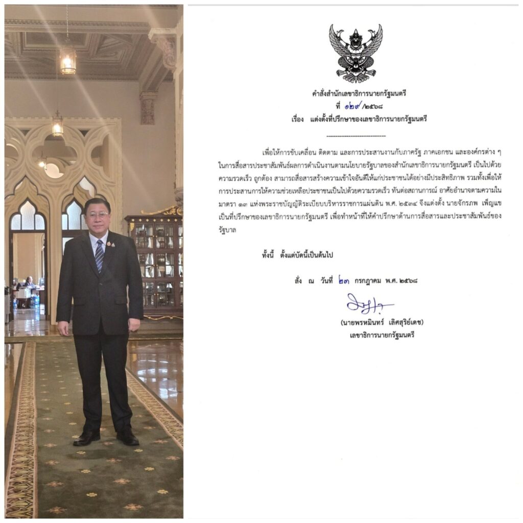 ผู้สื่อข่าวรายงานว่า นพ.พรหมินทร์ เลิศสุริย์เดช เลขาธิการนายกรัฐมนตรี ลงนามคำ สั่งแต่งตั้งนายจักรภพ เพ็ญแข เป็นที่ปรึกษาของเลขาธิการนายกรัฐมนตรี ทำหน้าที่ให้คำปรึกษาด้านการสื่อสารและประชาสัมพันธ์ของรัฐบาล ลงวันที่ 23 กรกฎาคม 2568