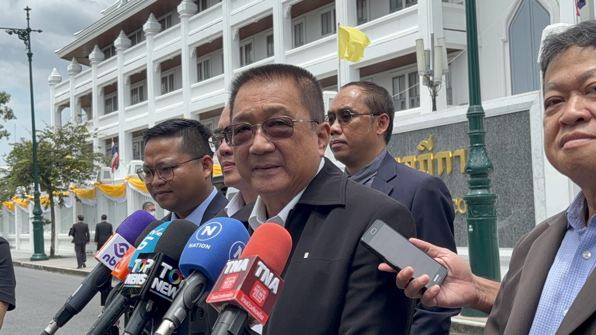 นายชาญชัย อิสระเสนารักษ์ อดีต สส.ประชาธิปัตย์ พร้อมด้วย นายแพทย์ตุลย์ สิทธิสมวงศ์ นายแพทย์วรงค์ เดชกิจวิกรม ประธานพรรคไทยภักดี และ นายสมชาย แสวงการ อดีต สว. ให้สัมภาษณ์ภายหลังการไต่สวนของศาลฎีกาแผนกคดีอาญาของผู้ดำรงตำแหน่งทางการเมือง กรณีการเข้ารับโทษของนายทักษิณ ชินวัตร อดีตนายกรัฐมนตรี