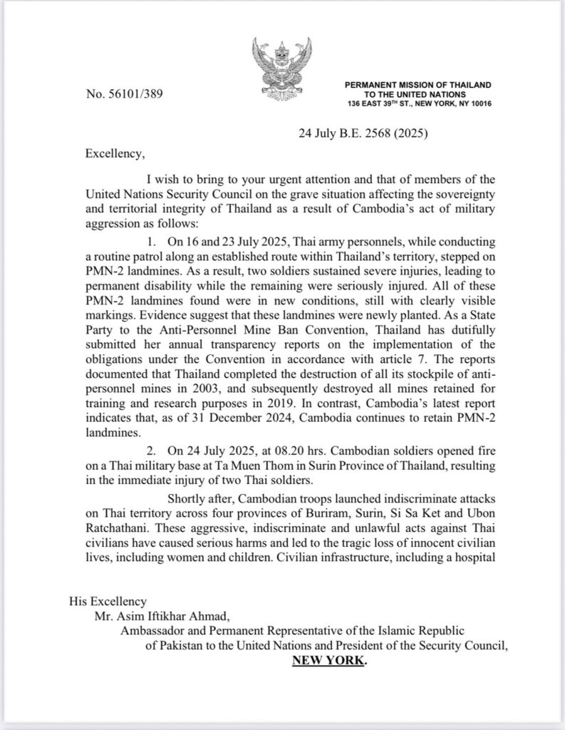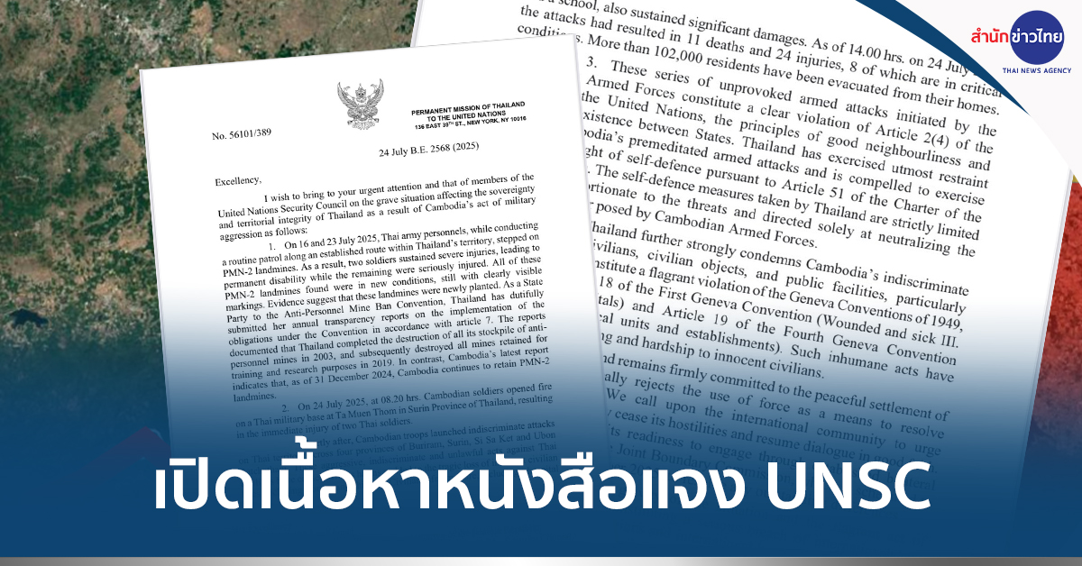 25 ก.ค.- เปิดเนื้อหาหนังสือจากผู้แทนถาวรไทยประจำสหประชาชาติที่นิวยอร์ก เพื่อชี้แจงต่อประธานคณะมนตรีความมั่นคงแห่งสหประชาชาติ ถึงสถานการณ์ชายแดนไทย-กัมพูชา