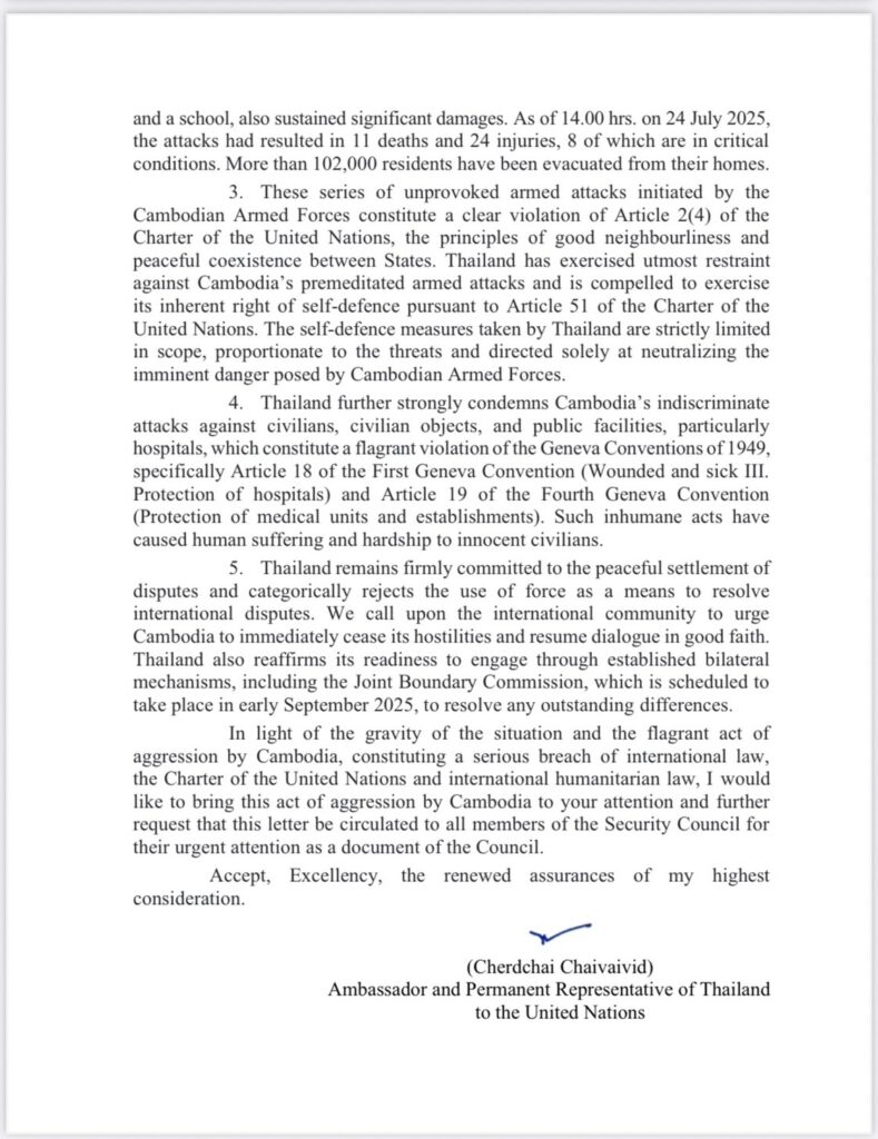 เมื่อพิจารณาถึงความร้ายแรงของสถานการณ์และการกระทำที่ก้าวร้าวอันโจ่งแจ้งของกัมพูชา ซึ่งเป็นการละเมิดกฎหมายระหว่างประเทศ กฎบัตรสหประชาชาติ และกฎหมายมนุษยธรรมระหว่างประเทศอย่างร้ายแรง ผมขอแจ้งให้ทราบถึงการกระทำอันก้าวร้าวของกัมพูชา และขอความกรุณาให้เผยแพร่หนังสือนี้ไปยังสมาชิกคณะมนตรีความมั่นคงแห่งสหประชาชาติทุกท่านให้รับทราบโดยเร็วที่สุด และนำเข้าสู่ระบบเอกสารของคณะมนตรีความมั่นคงฯ ด้วยความเคารพอย่างสูง -สำนักข่าวไทย