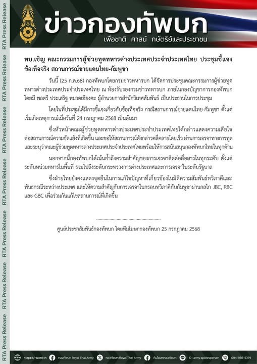 โดยในที่ประชุมได้มีการชี้แจงเกี่ยวกับข้อเท็จจริง กรณีสถานการณ์ชายแดนไทย-กัมพูชา ตั้งแต่เริ่มเกิดเหตุการณ์เมื่อวันที่ 24 กรกฎาคม 2568 เป็นตันมา ซึ่งหัวหน้าคณะผู้ช่วยทูตทหารต่างประเทศประจำประเทศไทยได้กล่าวแสดงความเสียใจต่อสถานการณ์ความขัดแย้งที่เกิดขึ้น และขอให้สถานการณ์ดังกล่าวคลี่คลายโดยเร็ว ผ่านการเจรจาทางการทูตและระบุว่าคณะผู้ช่วยทูตทหารต่างประเทศประจำประเทศไทยพร้อมให้การสนับสนุนกองทัพบกไทยในทุกด้าน