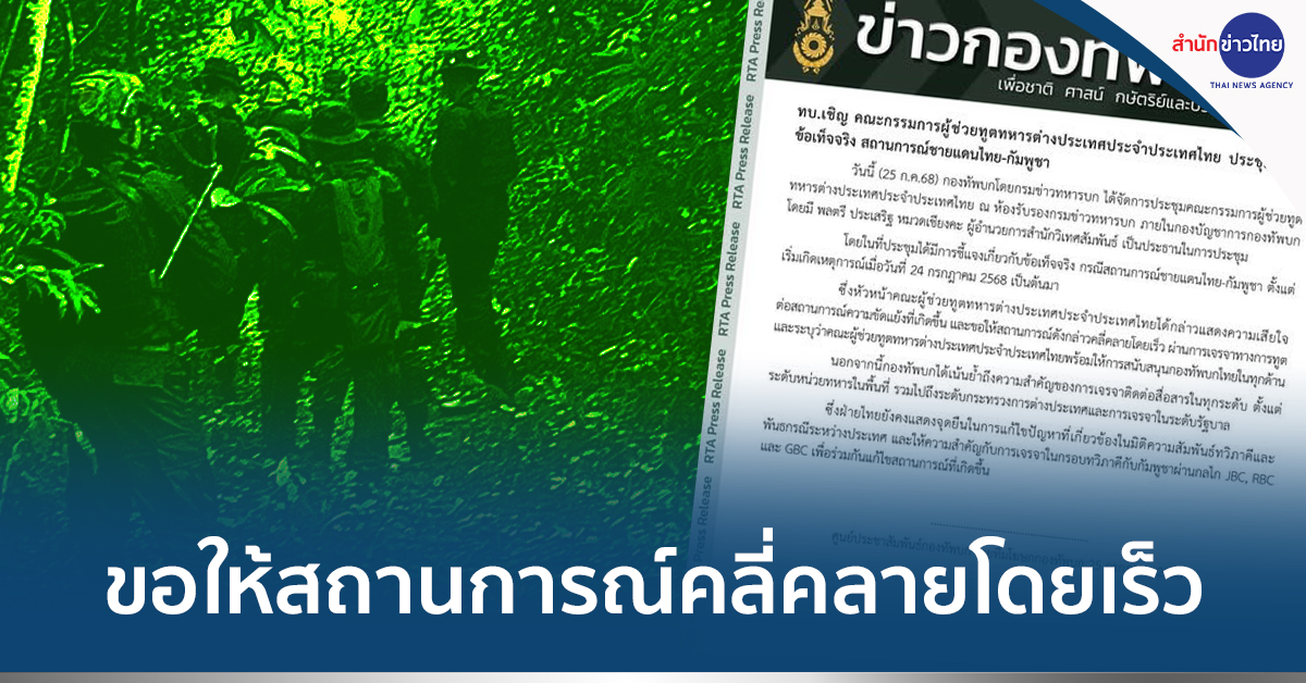 25 ก.ค.- ผู้ช่วยทูตทหาร ตปท. แสดงความเสียใจต่อสถานการณ์ความขัดแย้งที่เกิดขึ้นระหว่างไทย-กัมพูชา และขอให้สถานการณ์คลี่คลายโดยเร็ว ด้าน ทบ.ย้ำความสำคัญเจรจาทุกระดับ