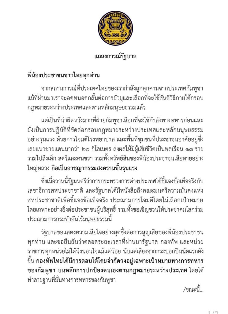 รัฐบาลขอแสดงความเสียใจอย่างสุดซึ้งต่อการสูญเสียของพี่น้องประชาชน ทุกท่าน และขอยืนยันว่าตลอดระยะเวลาที่ผ่านมารัฐบาล กองทัพ และหน่วยราชการทุกหน่วยไม่ได้นิ่งนอนใจแม้แต่น้อย นับแต่เสียงจากกระบอกปืนนัดแรกดังขึ้น กองทัพไทยได้มีการตอบโต้โดยจำกัดวงอยู่เฉพาะเป้าหมายทางการทหารของกัมพูชา บนหลักการปกป้องตนเองตามกฎหมายระหว่างประเทศ โดยได้ทำลายฐานที่มั่นทางการทหารของกัมพูชา