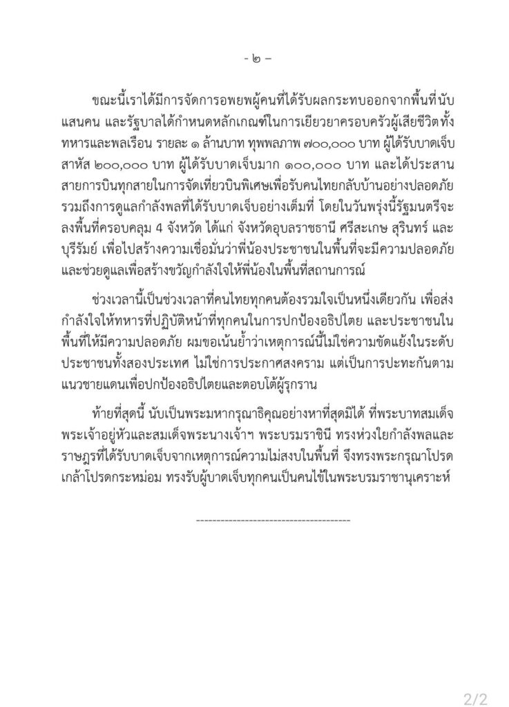 ขณะนี้เราได้มีการจัดการอพยพผู้คนที่ได้รับผลกระทบออกจากพื้นที่นับแสนคน และรัฐบาลได้กำหนดหลักเกณฑ์ในการเยียวยาครอบครัวผู้เสียชีวิตทั้งทหารและพลเรือน รายละ 1 ล้านบาท ทุพพลภาพ 700,000 บาท ผู้ได้รับบาดเจ็บสาหัส 200,000 บาท ผู้ได้รับบาดเจ็บมาก 100,000 บาท และได้ประสาน สายการบินทุกสายในการจัดเที่ยวบินพิเศษเพื่อรับคนไทยกลับบ้านอย่างปลอดภัยรวมถึงการดูแลกำลังพลที่ได้รับบาดเจ็บอย่างเต็มที่ โดยในวันพรุ่งนี้(26 ก.ค.) รัฐมนตรีจะลงพื้นที่ครอบคลุม 4 จังหวัด ได้แก่ จังหวัดอุบลราชธานี ศรีสะเกษ สุรินทร์ และบุรีรัมย์ เพื่อไปสร้างความเชื่อมั่นว่าพี่น้องประชาชนในพื้นที่จะมีความปลอดภัย และช่วยดูแลเพื่อสร้างขวัญก าลังใจให้พี่น้องในพื้นที่สถานการณ์ ช่วงเวลานี้เป็นช่วงเวลาที่คนไทยทุกคนต้องรวมใจเป็นหนึ่งเดียวกัน เพื่อส่งกำลังใจให้ทหารที่ปฏิบัติหน้าที่ทุกคนในการปกป้องอธิปไตย และประชาชนใน พื้นที่ให้มีความปลอดภัย ผมขอเน้นย้ าว่าเหตุการณ์นี้ไม่ใช่ความขัดแย้งในระดับประชาชนทั้งสองประเทศ ไม่ใช่การประกาศสงคราม แต่เป็นการปะทะกันตาม แนวชายแดนเพื่อปกป้องอธิปไตยและตอบโต้ผู้รุกราน