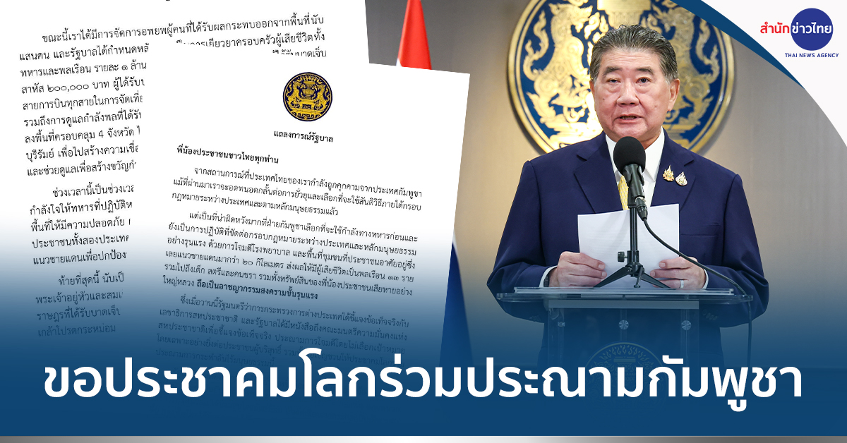 ทำเนียบฯ 25 ก.ค.- “ภูมิธรรม” อ่านแถลงการณ์รัฐบาลไทย นับเป็นพระมหากรุณาธิคุณในหลวง-พระราชินี รับผู้บาดเจ็บทุกคนจากเหตุการณ์ปะทะชายแดนไทย-กัมพูชา ไว้ในพระบรมราชานุเคราะห์ ชี้ กัมพูชา ใช้กำลังทหารโจมตีพื้นที่ชุมชน-โรงพยาบาล ขัดกรอบกฎหมายระหว่างประเทศและหลักมนุษยธรรม ลั่น เป็นอาชญากรรมสงครามขั้นรุนแรง ขอประชาคมโลกร่วมประณามการกระทำไร้ซึ่งมนุษยธรรม พร้อมแสดงความเสียใจอย่างสุดซึ้งต่อผู้สูญเสีย ยืนยัน รัฐบาลไทยไม่นิ่งนอนใจ บอก กองทัพไทยตอบโต้ทันทีนับตั้งแต่เสียงกระบอกปืนนัดแรกดัง