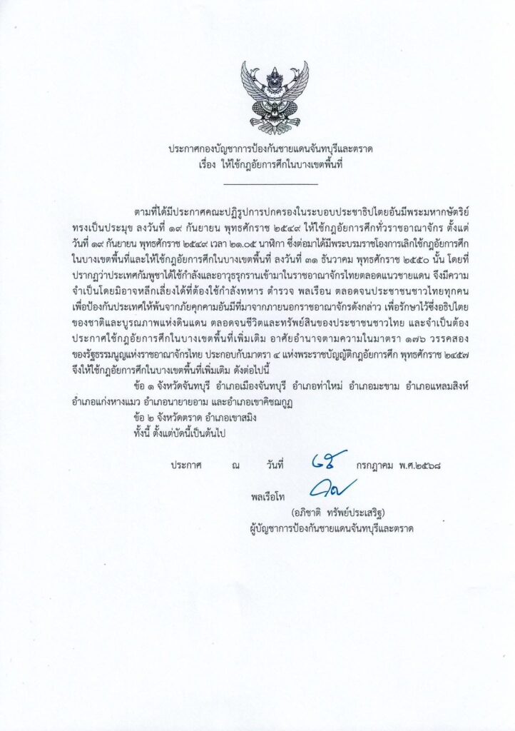 นายจิรายุ ห่วงทรัพย์ โฆษกประจำสำนักนายกรัฐมนตรี เผยว่า กองบัญชาการป้องกันชายแดนจันทบุรีและตราด ประกาศให้ใช้กฎอัยการศึกใน อำเภอเมืองจันทบุรี อำเภอท่าใหม่ อำเภอมะขาม อำเภอแหลมสิงห์ อำเภอแก่งหางแมว อำเภอนายายอาม และอำเภอเขาคิชฌกูฏ จังหวัดจันทบุรี และอำเภอเขาสมิง จังหวัดตราด เนื่องจากจำเป็นโดยมิอาจหลีกเลี่ยงได้ที่ต้องใช้กำลังทหาร ตำรวจ พลเรือน ตลอดจนประชาชนชาวไทยทุกคน เพื่อป้องกันประเทศให้พ้นจากภัยคุกคามอันมีที่มาจากภายนอกราชอาณาจักร เพื่อรักษาไว้ซึ่งอธิปไตยของชาติและบูรณภาพแห่งดินแดน ตลอดจนชีวิตและทรัพย์สินของประชาชนชาวไทย จึงจำเป็นต้องประกาศใช้กฎอัยการศึกในบางเขตพื้นที่เพิ่มเติม