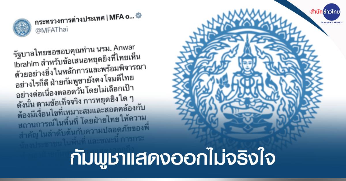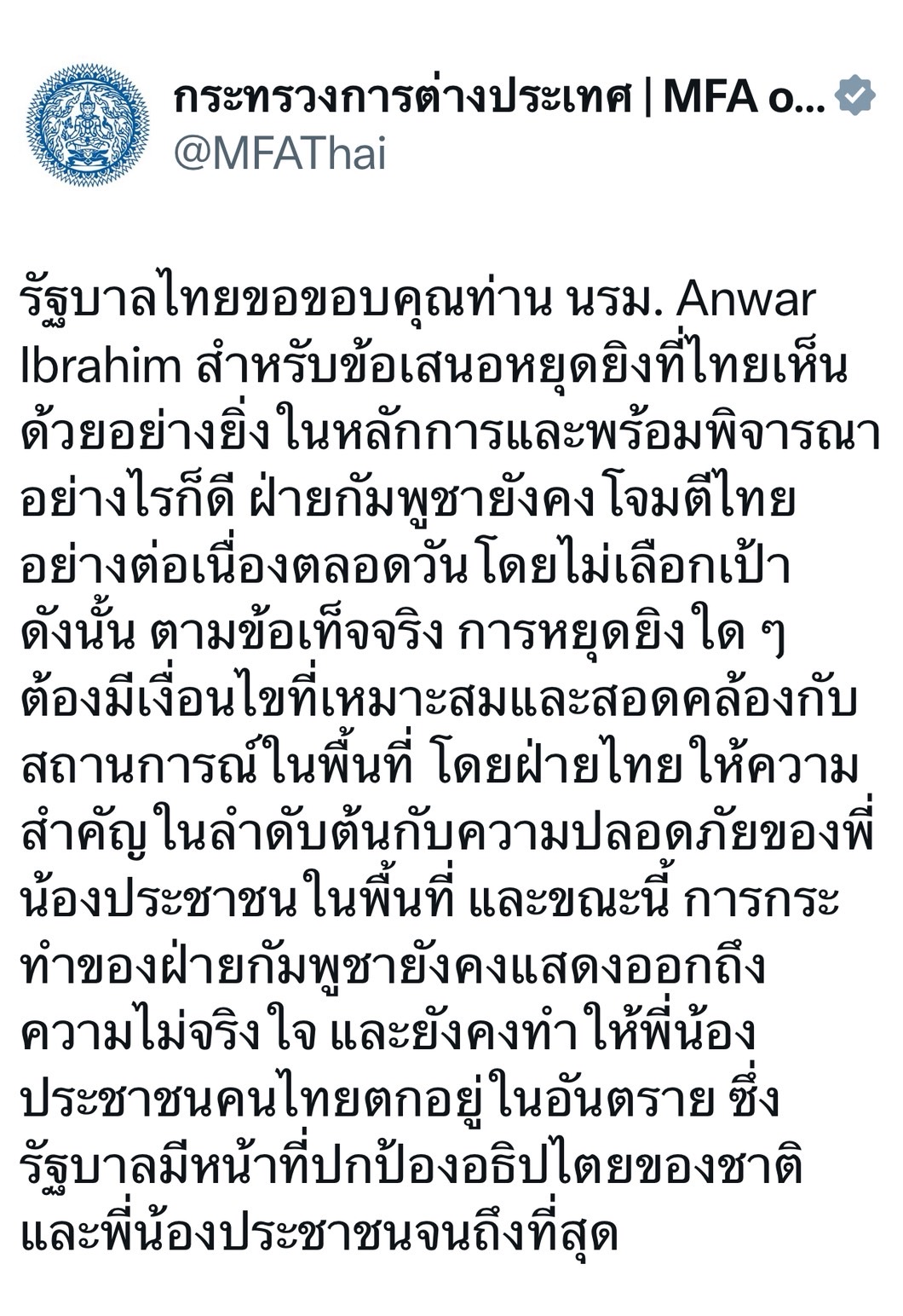กระทรวงการต่างประเทศ โพสต์ข้อความผ่านแพลตฟอร์ม X ระบุว่า รัฐบาลไทยขอขอบคุณท่าน นรม. Anwar Ibrahim สำหรับข้อเสนอหยุดยิงที่ไทยเห็นด้วยอย่างยิ่งในหลักการและพร้อมพิจารณา อย่างไรก็ดี ฝ่ายกัมพูชายังคงโจมตีไทยอย่างต่อเนื่องตลอดวันโดยไม่เลือกเป้า