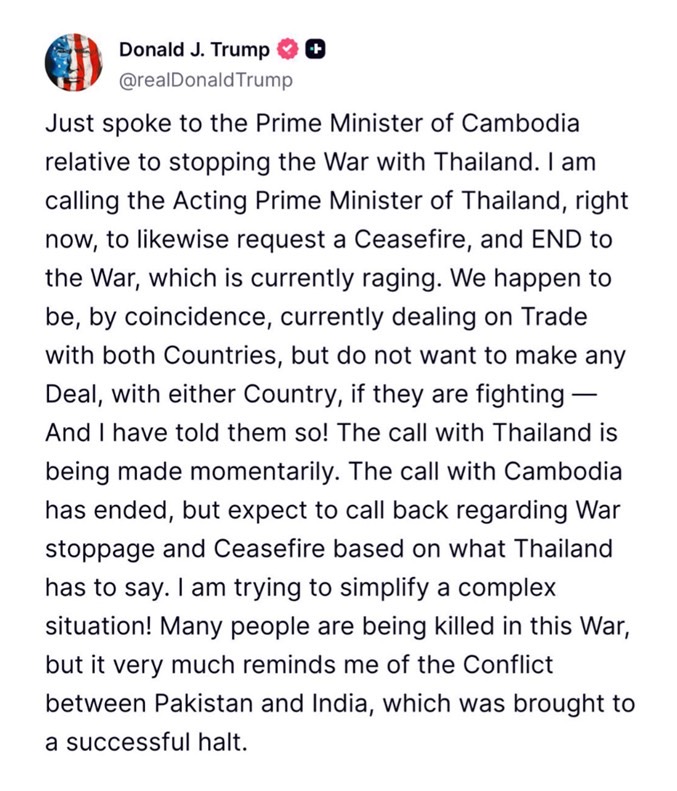 นายภูมิธรรม เวชยชัย รองนายกรัฐมนตรี และรัฐมนตรีว่าการกระทรวงมหาดไทย ในฐานะรักษาราชการแทนนายกรัฐมนตรี ได้โพสต์ข้อความผ่านfacebook Phumtham Wechayachai เมื่อคืนวานนี้ (27 ก.ค.) ว่า ได้สนทนาทางโทรศัพท์กับประธานาธิบดีโดนัลด์ ทรัมป์ แห่งสหรัฐอเมริกา ซึ่งได้เสนอให้ประเทศไทยและกัมพูชาดำเนินการหยุดยิงโดยทันที เพื่อยุติความขัดแย้งที่กำลังเกิดขึ้นบริเวณชายแดน