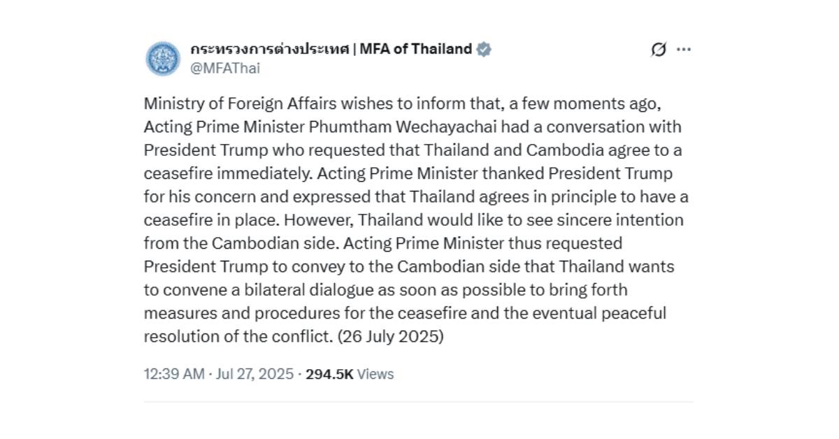 กระทรวงการต่างประเทศขอแจ้งว่า เมื่อครู่ที่ผ่านมา นายภูมิธรรม เวชยชัย รักษาการนายกรัฐมนตรี ได้สนทนาทางโทรศัพท์กับประธานาธิบดีโดนัลด์ ทรัมป์ ซึ่งได้เสนอให้ประเทศไทยและกัมพูชาดำเนินการหยุดยิงโดยทันที รักษาการนายกรัฐมนตรีได้กล่าวขอบคุณต่อความห่วงใยและความปรารถนาดีของฝ่ายสหรัฐฯ และยืนยันว่า ในหลักการ ฝ่ายไทยเห็นชอบต่อการหยุดยิง อย่างไรก็ดี ฝ่ายไทยประสงค์ที่จะเห็นความตั้งใจจริงของฝ่ายกัมพูชาในเรื่องดังกล่าว จึงขอให้ฝ่ายสหรัฐฯ ช่วยถ่ายทอดไปยังฝ่ายกัมพูชาว่า ฝ่ายไทยประสงค์ให้มีการหารือแบบทวิภาคีโดยเร็วที่สุด เพื่อร่วมกันกำหนดมาตรการและกระบวนการที่ชัดเจนสำหรับการหยุดยิง และนำไปสู่การยุติข้อพิพาทอย่างสันติและยั่งยืนต่อไป (26 ก.ค. 2568)