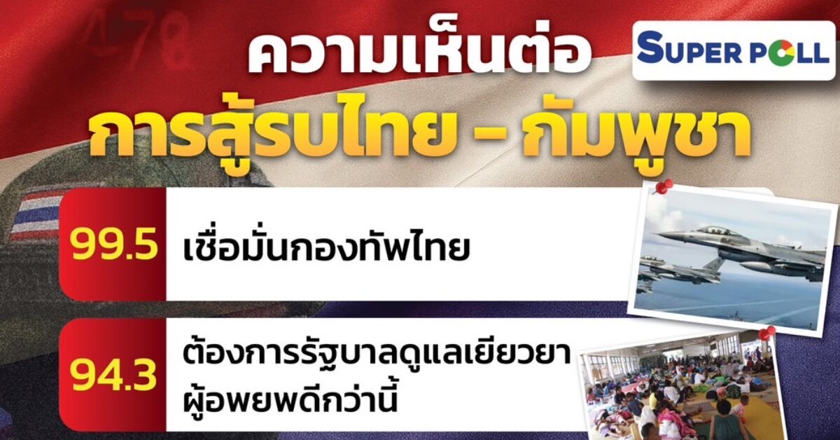กทม. 27 ก.ค. – ซูเปอร์โพล เผยคนไทย 99.5% เชื่อมั่นกองทัพ ป้องผืนแผ่นดินไทยได้ ห่วงใยผู้อพยพ เรียกร้องมาตรการรัฐบาลแก้ให้ตรงจุด ติงฟังเสียง ปชช.ให้มากกว่าสร้างคะแนนนิยม