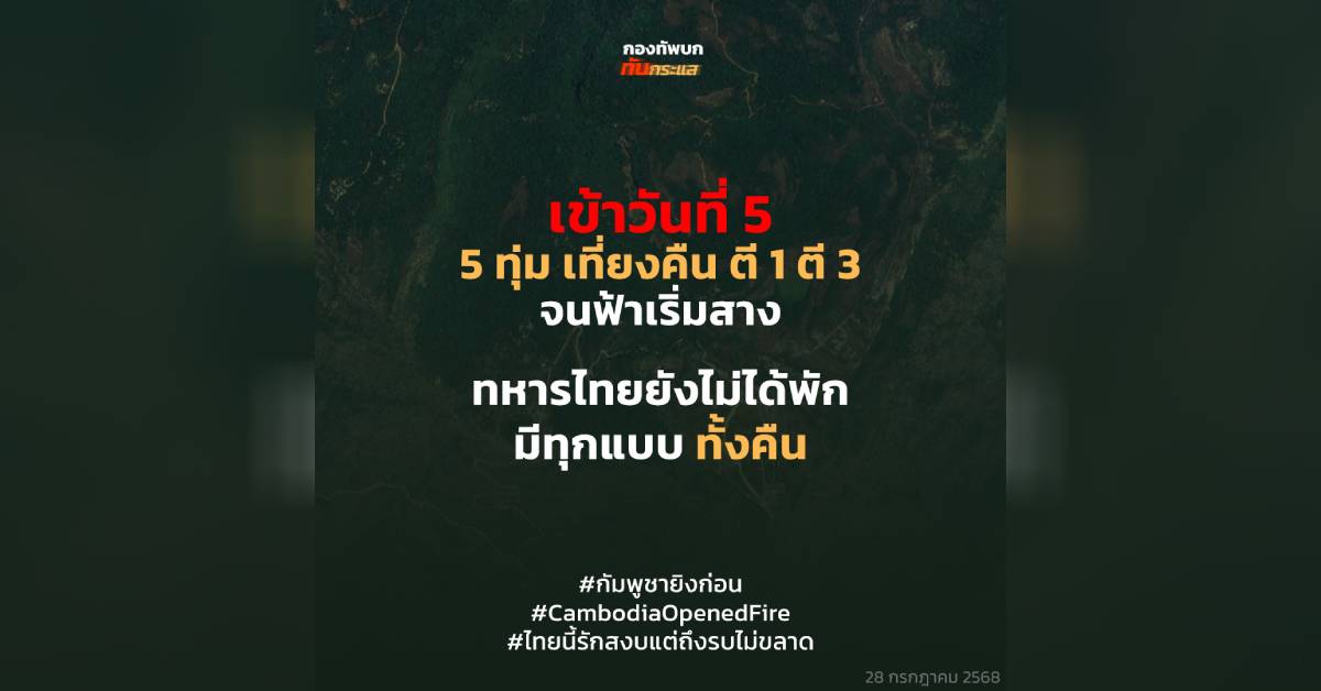 กองทัพบก ทันกระแส รายงานว่า เข้าวันที่ 5 ของการสู้รบระหว่างไทย-กัมพูชา ตั้งแต่ 5 ทุ่ม เที่ยงคืน ตี 1 ตี 3 จนฟ้าเริ่มสาง ทหารไทยยังไม่ได้พัก มีทุกแบบ ทั้งคืน