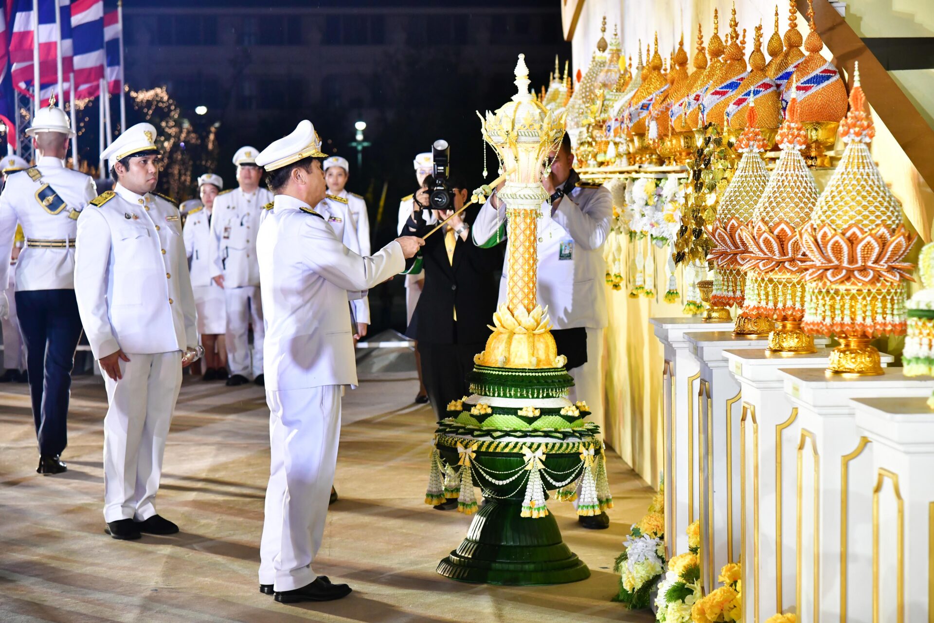 เมื่อรองนายกรัฐมนตรี และภริยา ถึงบริเวณพิธีท้องสนามหลวง ขึ้นสู่เวที รองนายกรัฐมนตรี ประธานวุฒิสภา (ผู้แทนประธานรัฐสภา) ประธานศาลฎีกา ทำวันทยหัตถ์ หน้าพระบรมฉายาลักษณ์พระบาทสมเด็จพระเจ้าอยู่หัว แล้ววางพุ่มทอง พุ่มเงิน รองนายกรัฐมนตรี ถวายธูปเทียนแพ ก่อนจุดเทียนถวายพระพรชัยมงคล