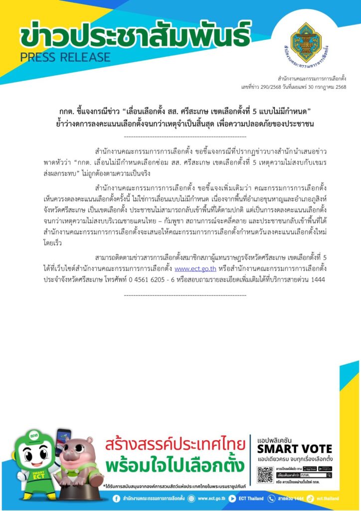 กกต. 30 ก.ค.- กกต. ชี้แจงกรณีข่าว “เลื่อนเลือกตั้ง สส. ศรีสะเกษ เขตเลือกตั้งที่ 5 แบบไม่มีกำหนด” ย้ำงดการลงคะแนนเลือกตั้งจนกว่าเหตุจำเป็นสิ้นสุด เพื่อความปลอดภัยของประชาชน