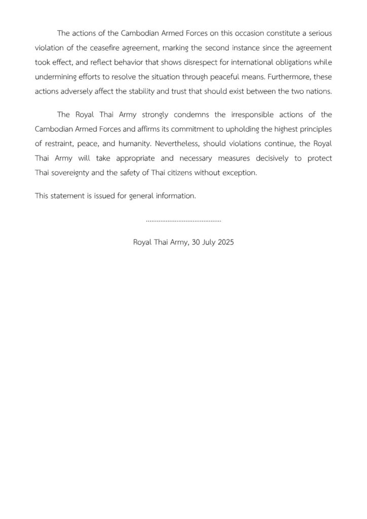 กองทัพบกขอประณามการกระทำอันไม่รับผิดชอบของกองทัพกัมพูชาอย่างถึงที่สุด และขอแจ้ง ให้ทราบว่า ฝ่ายไทยจะยังคงดำรงตนอยู่บนหลักแห่งความอดกลั้น สันติภาพ และมนุษยธรรมอย่างสูงสุด อย่างไรก็ดี หากมีการละเมิดต่อเนื่อง กองทัพบกจะดำเนินการตามขั้นตอนที่เหมาะสมและจำเป็นอย่าง เด็ดขาด เพื่อปกป้องอธิปไตยและความปลอดภัยของประชาชนไทยโดยไม่ละเว้น จึงเรียนมาเพื่อทราบโดยทั่วกัน.-315 -สำนักข่าวไทย