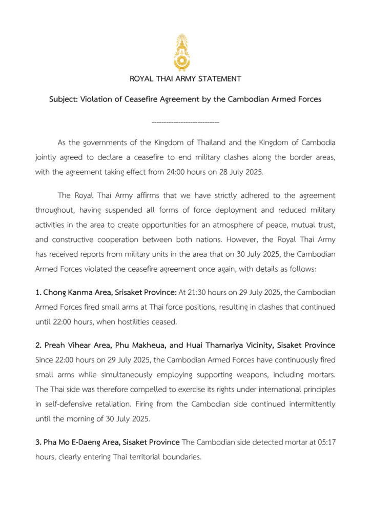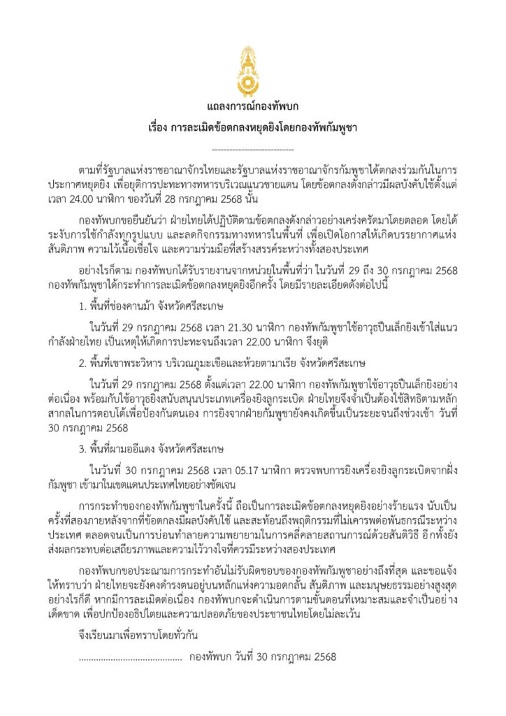 อย่างไรก็ตาม กองทัพบกได้รับรายงานจากหน่วยในพื้นที่ว่า ในวันที่ 29 – 30 กรกฎาคม 2568 กองทัพกัมพูชาได้กระทำการละเมิดข้อตกลงหยุดยิงอีกครั้ง โดยมีรายละเอียดดังต่อไปนี้