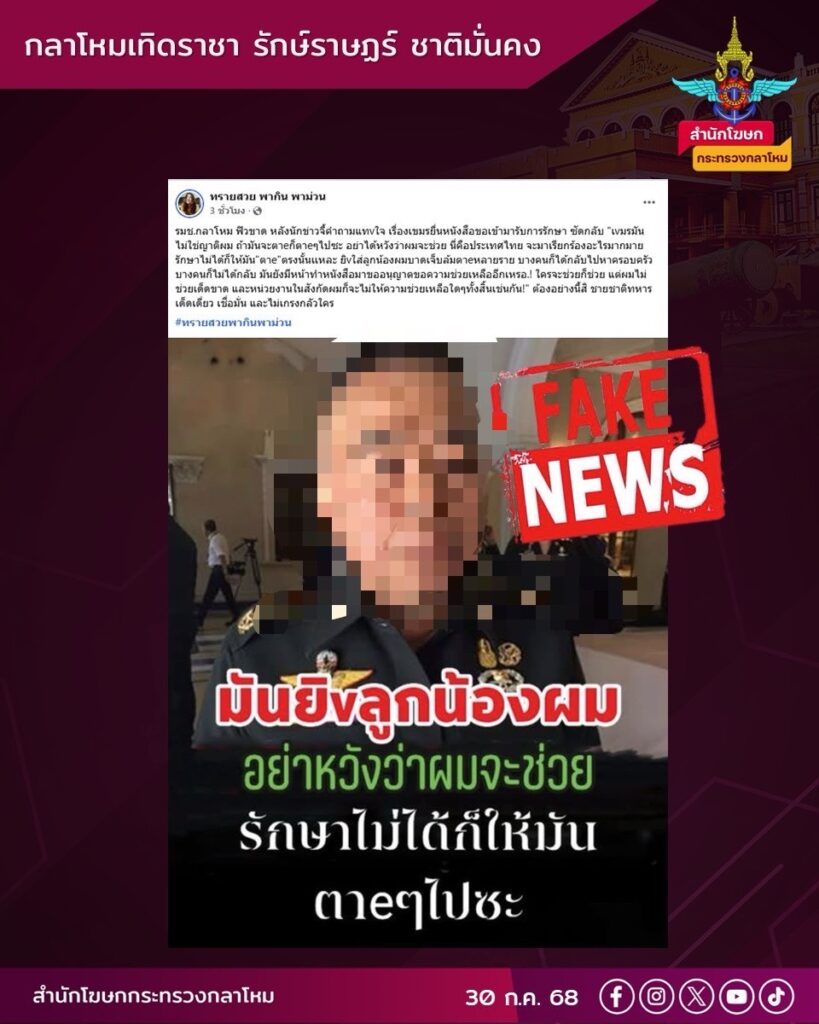 เมื่อวันที่ 31 ก.ค.68 ผู้สื่อข่าวรายงานว่า จากกรณีที่โซเชียลกัมพูชาได้มีการเผยแพร่อ้างว่า รมช.กลาโหม พูดเหยียดกัมพูชา พล.อ.ณัฐพล นาคพาณิชย์ รมช.กลาโหม และ ผอ.ศบ.ทก. ยืนยันว่าไม่เคยพูดและไม่เคยให้สัมภาษณ์ใดๆตามข้อความและภาพที่เพจเหล่านี้เผยแพร่พร้อมชี้แจงว่าทหารกัมพูชา 18 นาย รุกล้ำเข้ามาในเขตไทย พร้อมอาวุธครบมือ และได้ ยอมจำนนต่อกองทัพไทย โดยไม่มีการขัดขืน กองทัพไทยจึงควบคุมตัวตามระเบียบทางทหาร และให้การดูแลขั้นพื้นฐานตาม หลักมนุษยธรรมสากล – อาหาร น้ำ ยารักษาโรค ครบถ้วน ส่วนผู้บาดเจ็บได้รับการส่งตัวรักษา โดยที่ผ่านมาสำหรับผู้เสียชีวิตได้ถูกส่งกลับประเทศอย่างให้เกียรติ