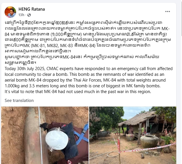 นายจิรายุ ห่วงทรัพย์ โฆษกประจำสำนักนายกรัฐมนตรี คณะกรรมการศูนย์เฉพาะกิจบริหารสถานการณ์ชายแดนไทย–กัมพูชา (ศบ.ทก.) เผยว่า สื่อกัมพูชาหลายสำนักรายงานอ้างคำกล่าว ของนาย แฮง รัตนา ผู้อำนวยการสำนักงานปฏิบัติการทุ่นระเบิดแห่งชาติกัมพูชา (CMAC) เมื่อวันพุธที่ 30 ก.ค. 2568 ว่า เจ้าหน้าที่ของ CMAC กำลังจัดการกับระเบิด MK-84 ซึ่งถูกทิ้งลงมาโดยเครื่องบินขับไล่ F-16 หรือเครื่องกริพเพนของไทย ซึ่งเป็นเรื่องโกหกทั้งสิ้น จนเราต้องตั้งคำถามทุกวันว่าวันนี้ “กัมพูชาโกหกอะไร …” ภาพดังกล่าว เป็นภาพขุดพบระเบิดเก่าตกค้างที่สหรัฐทิ้งใส่กองกำลังเวียดนามเหนือและเวียดกงในกัมพูชา สมัยสงครามเวียดนาม ช่วงปี ค.ศ. 1970-1973 แต่กัมพูชากลับใช้ภาพดังกล่าวนำมาบิดเบือนว่าเป็นระเบิดที่ F16 ไทยทิ้งใส่กัมพูชา